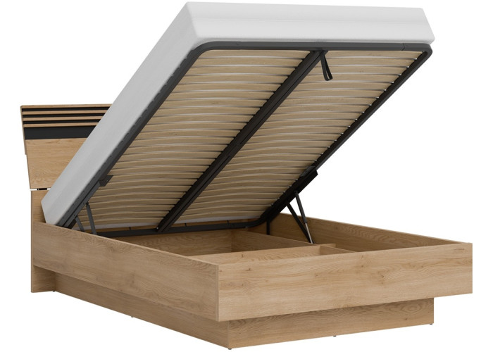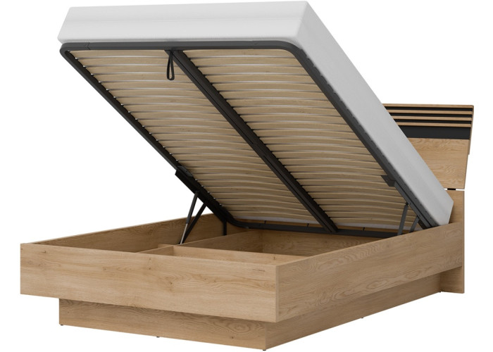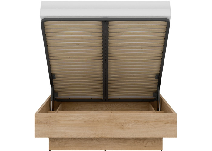 Z hľadiska kvality je posteľ vyrobená z pevnej 16 mm laminovanej drevotriesky s ABS hranami. Súčasťou balenia je už zahrnutý výklopný rošt v ráme, ktorý zabezpečuje stabilitu a správne prevetrávanie matraca. Posteľ sa dodáva bez matraca, čo vám umožňuje individuálne si zvoliť tvrdosť a typ podľa vašich preferencií. Kľúčovou výhodou tohto modelu je úložný priestor skrytý pod ložnou plochou, prístupný vďaka jednoduchému výklopnému mechanizmu. Je to ideálne riešenie na odkladanie sezónnych vecí, lôžkovín či iných doplnkov.