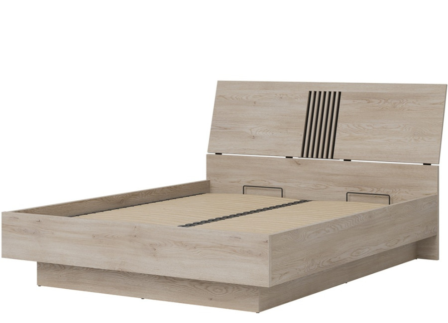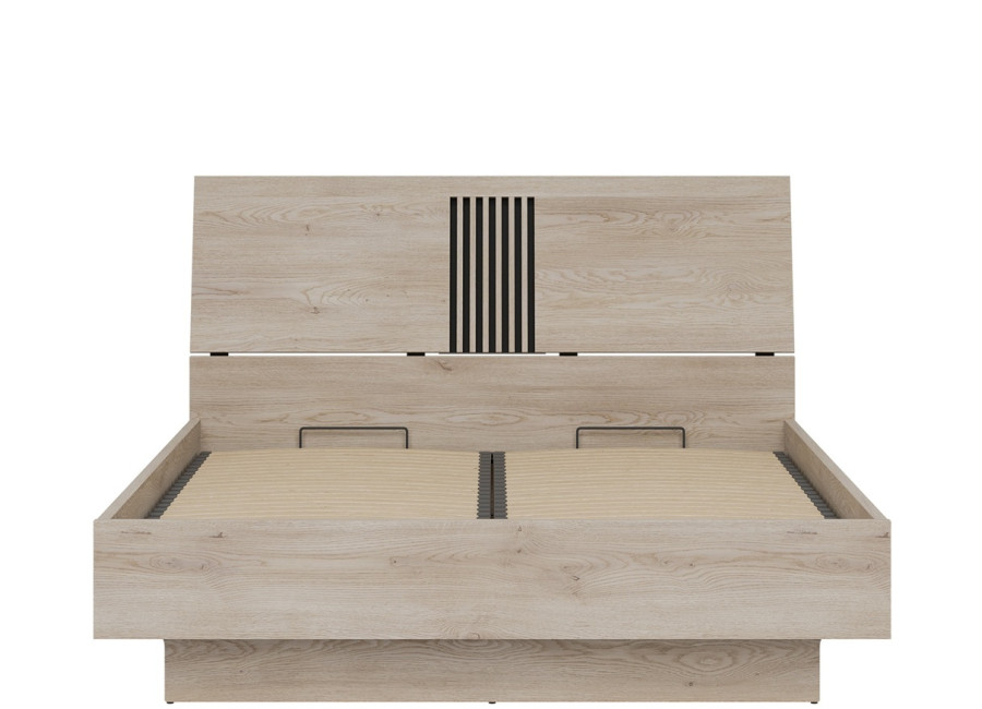 Manželská posteľ MATI MI18/160SP s rozmerom ložnej plochy 160×200 cm je dokonalým spojením moderného štýlu a praktického využitia priestoru. Výrazným prvkom je čelo postele s vertikálnymi lamelami na čiernom podklade, ktoré vytvárajú pôsobivý kontrast s prírodným dekorom dub cremona cotta. Vďaka tomuto dizajnu sa posteľ prirodzene stane dominantou každej spálne a dodá jej osobitý charakter.