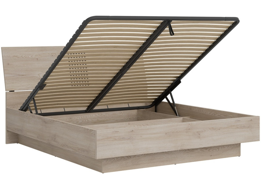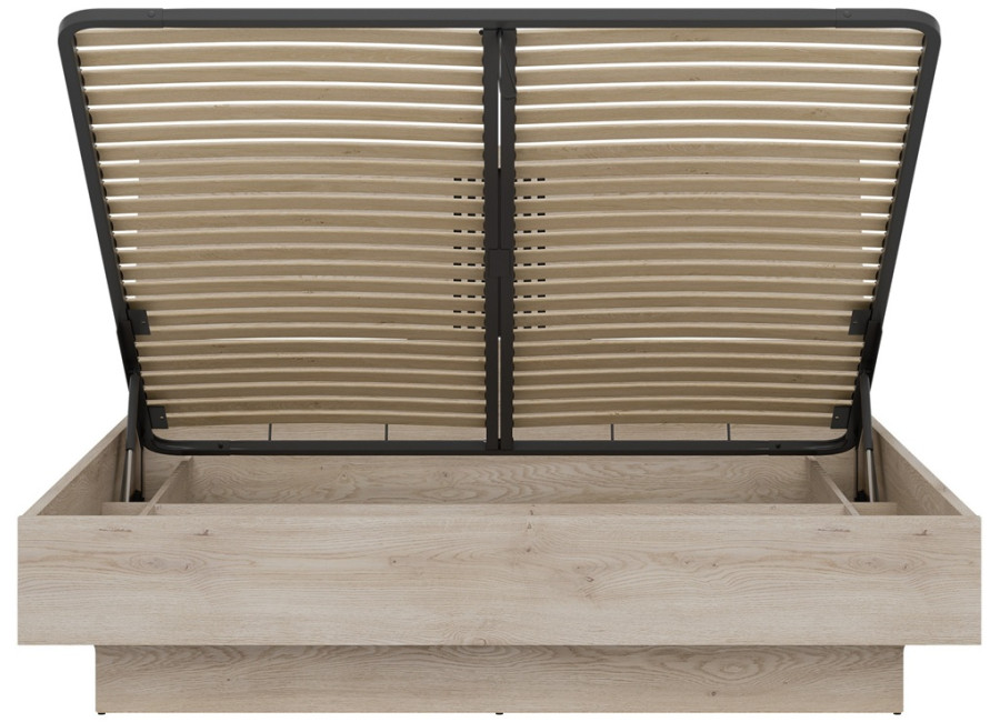 Konštrukcia je vyrobená zo 16 mm laminovanej drevotriesky, doplnenej o ABS hrany. Súčasťou postele je praktický výklopný rošt v pevnom ráme, zabezpečujúci optimálnu oporu aj dostatočné odvetrávanie matraca. Matrac nie je súčasťou balenia, čo vám dáva možnosť vybrať si presne taký typ a tvrdosť, aké vám najviac vyhovujú. Veľkou výhodou je priestranný úložný priestor ukrytý pod ložnou plochou, ku ktorému sa jednoducho dostanete pomocou výklopného mechanizmu.