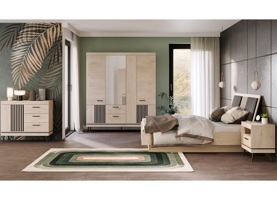 Manželská posteľ MATI MI18/180SP s rozmerom ložnej plochy 180×200 cm je dokonalým spojením moderného štýlu a praktického využitia priestoru. Výrazným prvkom je čelo postele s vertikálnymi lamelami na čiernom podklade, ktoré vytvárajú pôsobivý kontrast s prírodným dekorom dub cremona cotta. Vďaka tomuto dizajnu sa posteľ prirodzene stane dominantou každej spálne a dodá jej osobitý charakter.