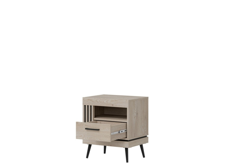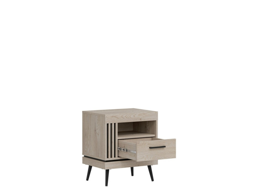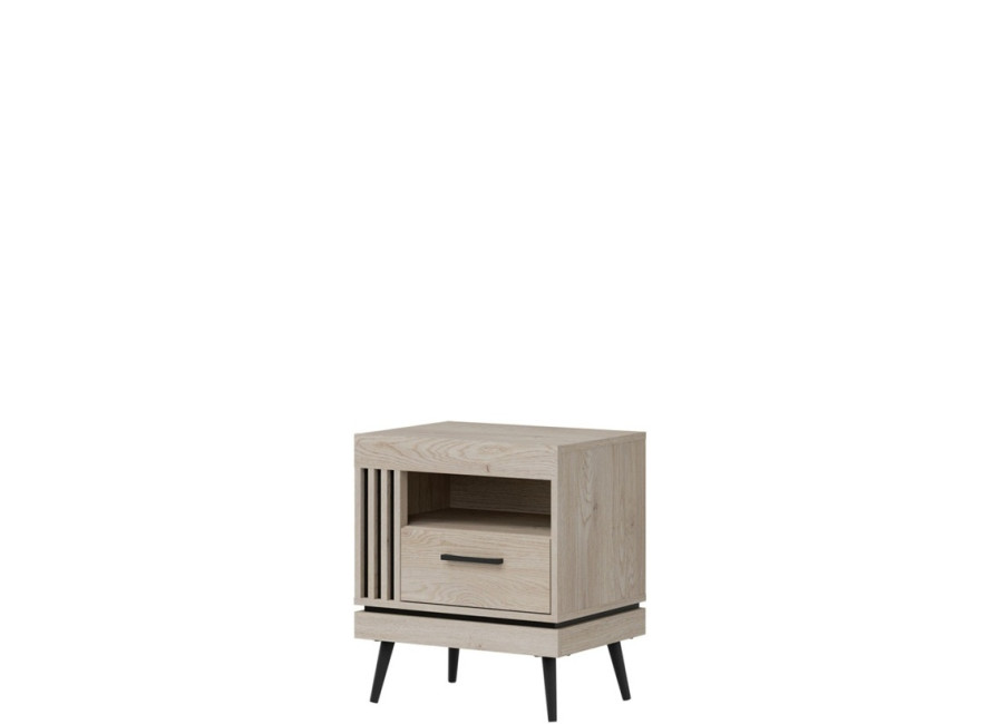 Nočný stolík MATI MI19 so šírkou 53,5 cm je dokonalým doplnkom k vašej posteli. Ponúka praktický priestor na lampu, rozčítanú knihu aj budík, aby ste mali všetko dôležité vždy poruke. Svojím vzhľadom prirodzene zapadne do každej spálne a harmonicky doplní ostatné prvky sektorového nábytku. Vyhotovený je v elegantnom dekore dub cremona cotta z kvalitného 16 mm lamina, ktoré dopĺňajú ABS hrany. Charakter mu dodávajú čierne kovové nožičky s výškou 15 cm a štýlové zvislé lamely na čiernom podklade, ktoré zvýrazňujú jeho moderný vzhľad. Praktická zásuvka s plným výsuvom poskytne dostatok miesta na okuliare, telefón či iné drobnosti, ktoré chcete mať bezpečne a nenápadne uložené.