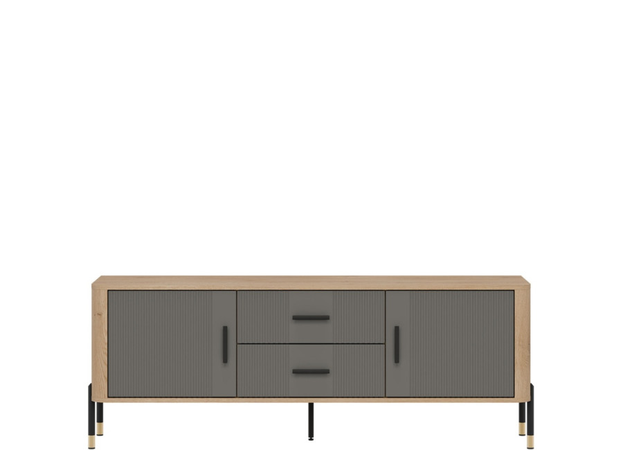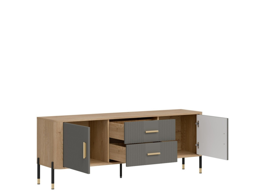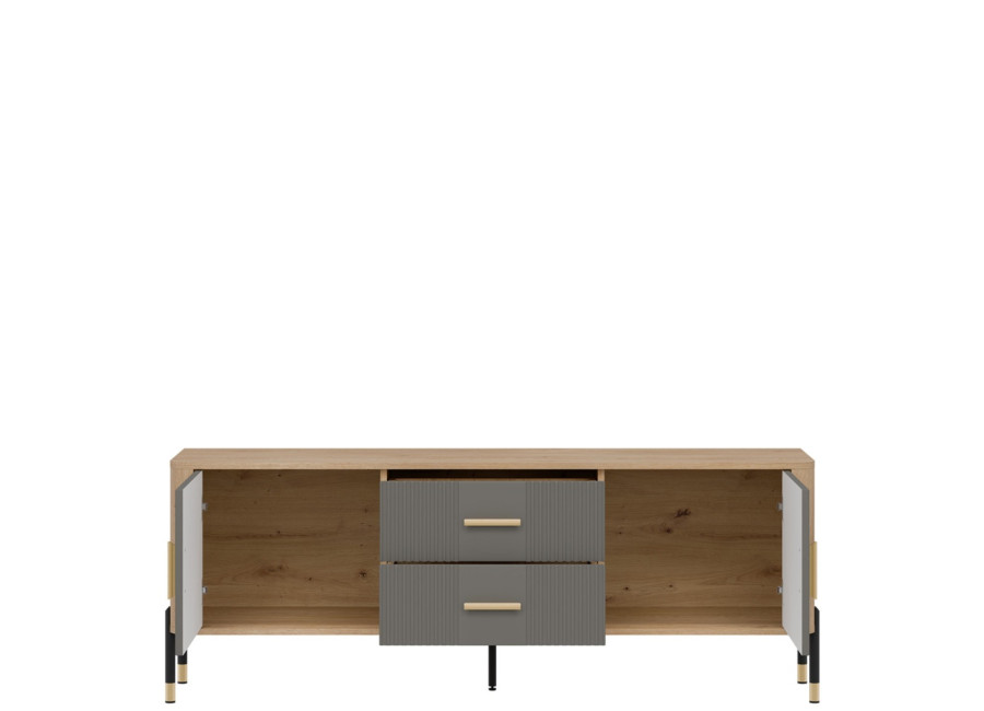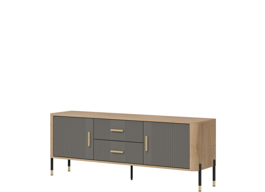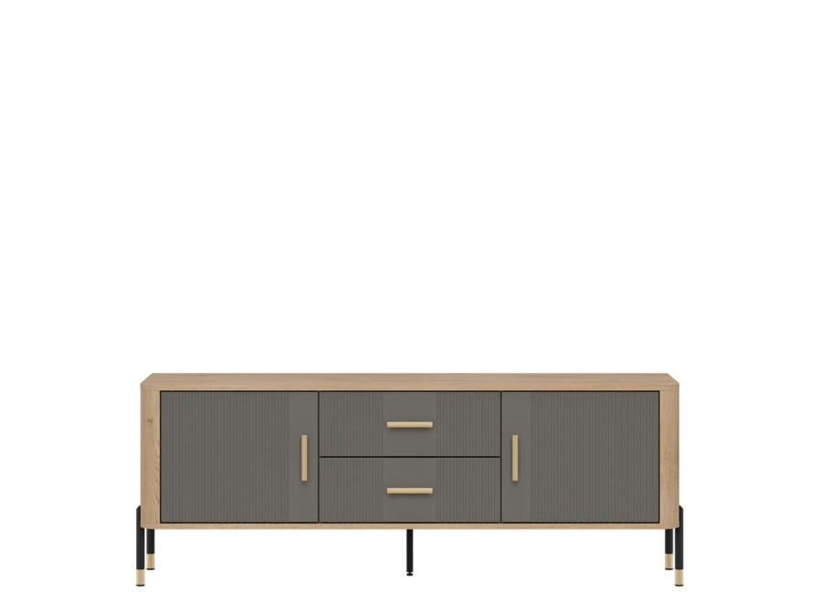 Skrinka pod TV DANTE spája moderný dizajn s praktickým využitím a zaujme kombináciou prírodného dekoru dub cremona torro so sivou matnou farbou na predných plochách. Kovové nožičky s detailmi v zlatej alebo čiernej farbe spolu s kovovými úchytkami podčiarkujú jej štýlový vzhľad, vďaka čomu sa skvele hodí do moderných, loftových aj škandinávskych miestností. Ponúka dostatok úložného priestoru v bočných skrinkách a zásuvkách, je ideálnou voľbou pre každého, kto hľadá vkusný TV stolík s dôrazom na kvalitu, funkčnosť a eleganciu.