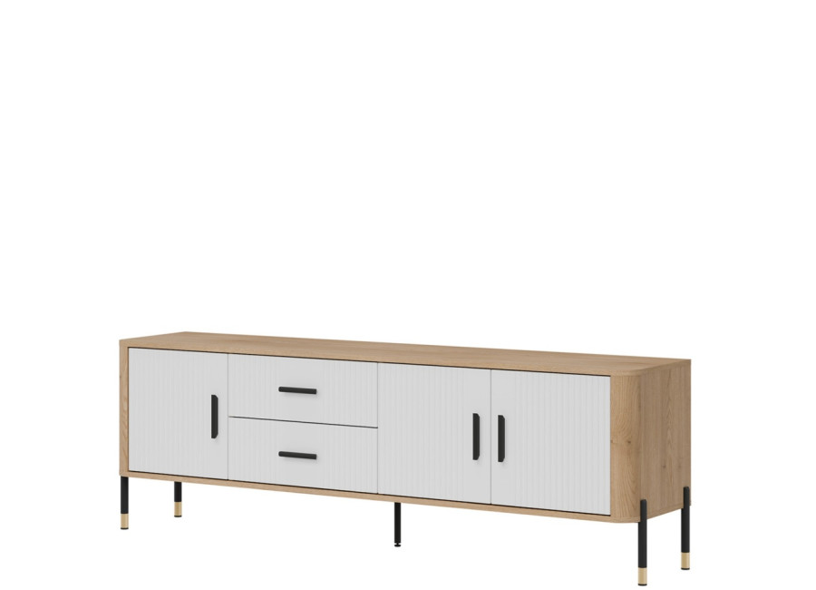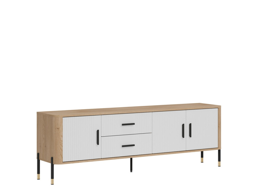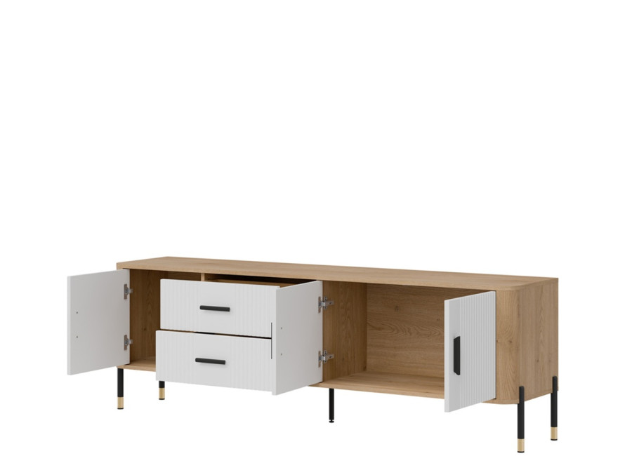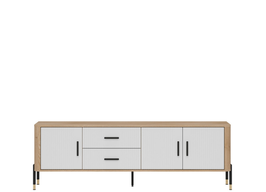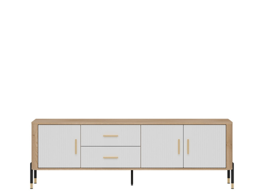 Skrinka pod TV DANTE spája moderný dizajn s praktickým využitím a zaujme kombináciou prírodného dekoru dub cremona torro s bielou farbou na predných plochách. Kovové nožičky s detailmi v zlatej alebo čiernej farbe spolu s kovovými úchytkami podčiarkujú jej štýlový vzhľad, vďaka čomu sa skvele hodí do moderných, loftových aj škandinávskych miestností. Ponúka dostatok úložného priestoru v bočných skrinkách a zásuvkách, je ideálnou voľbou pre každého, kto hľadá vkusný TV stolík s dôrazom na kvalitu, funkčnosť a eleganciu.