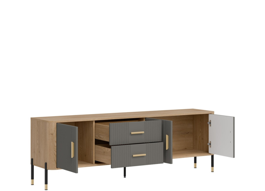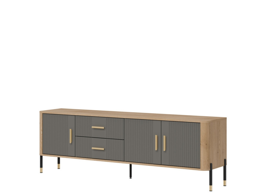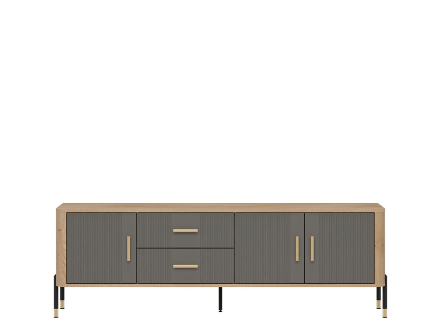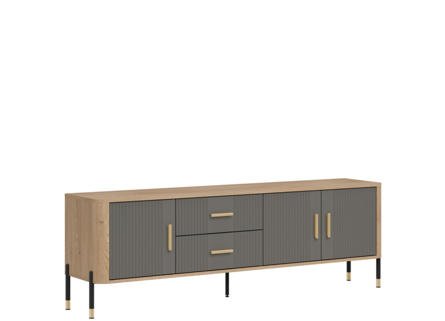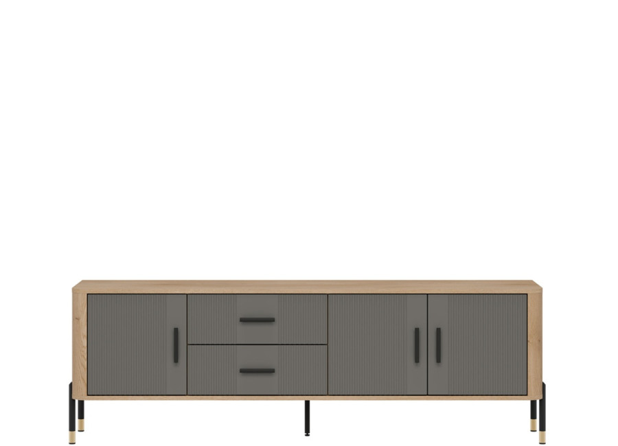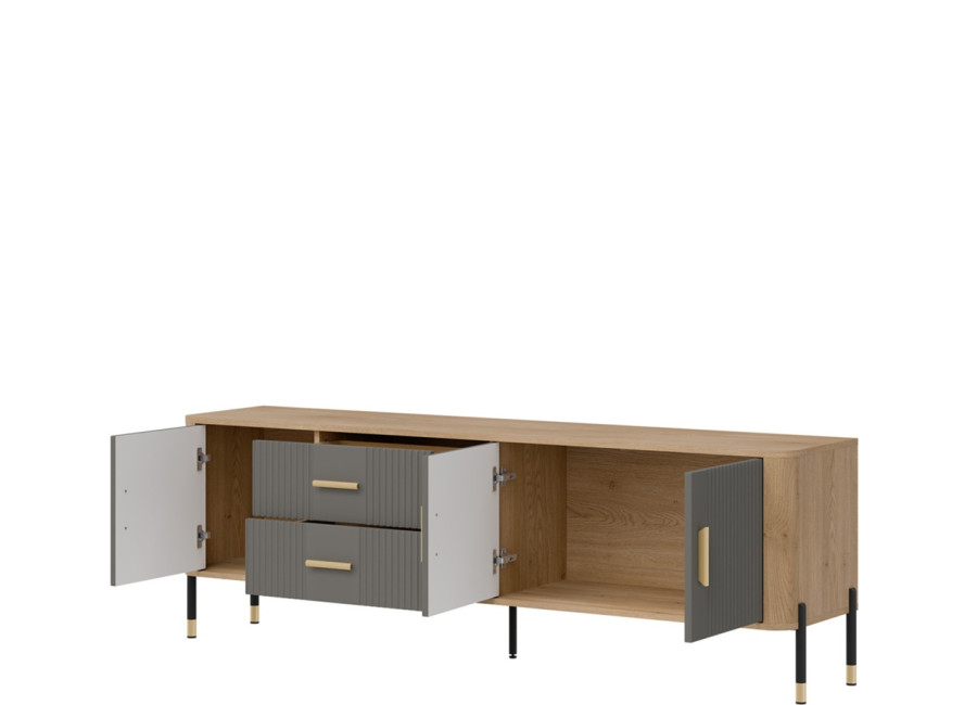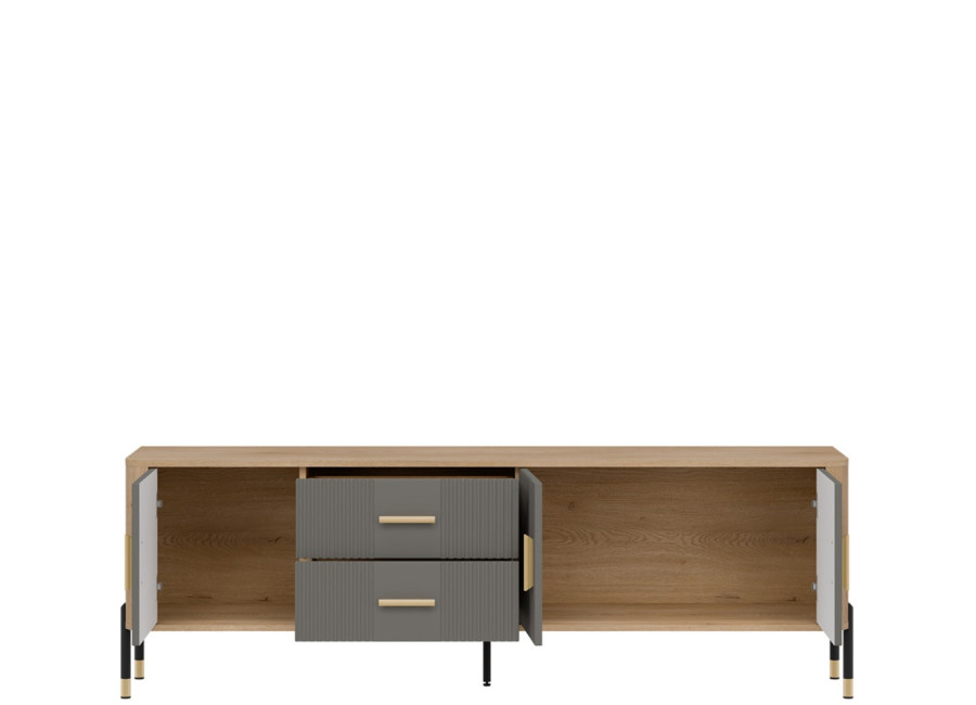 Skrinka pod TV DANTE spája moderný dizajn s praktickým využitím a zaujme kombináciou prírodného dekoru dub cremona torro so sivou farbou na predných plochách. Kovové nožičky s detailmi v zlatej alebo čiernej farbe spolu s kovovými úchytkami podčiarkujú jej štýlový vzhľad, vďaka čomu sa skvele hodí do moderných, loftových aj škandinávskych miestností. Ponúka dostatok úložného priestoru v bočných skrinkách a zásuvkách, je ideálnou voľbou pre každého, kto hľadá vkusný TV stolík s dôrazom na kvalitu, funkčnosť a eleganciu.