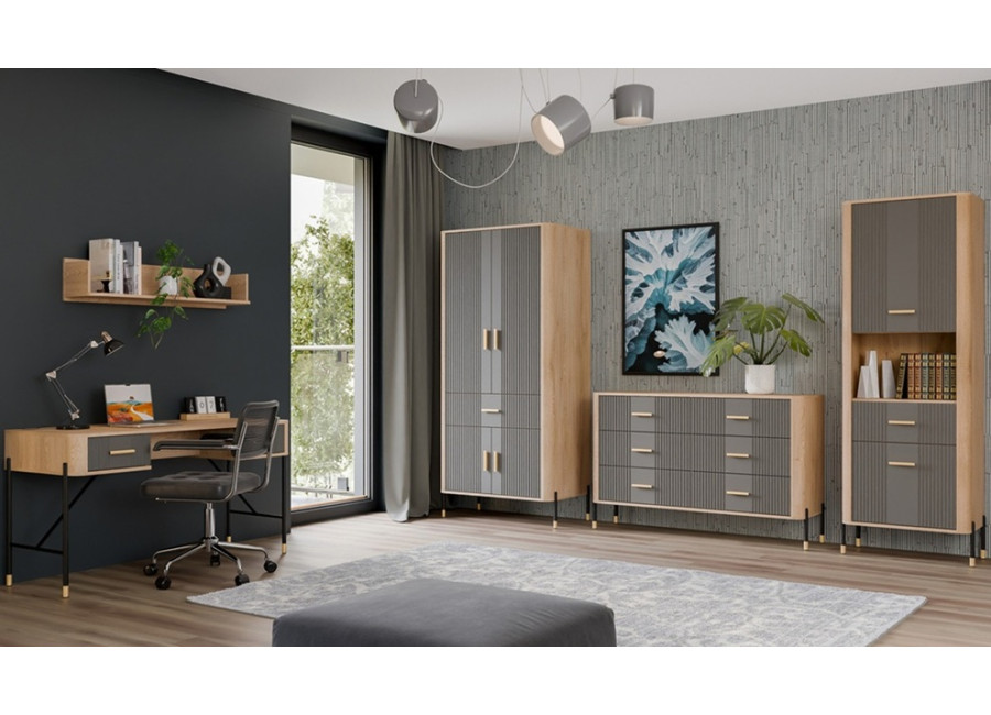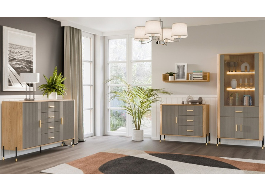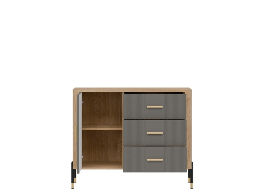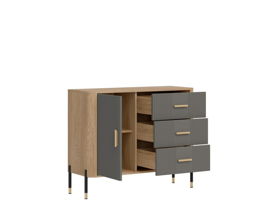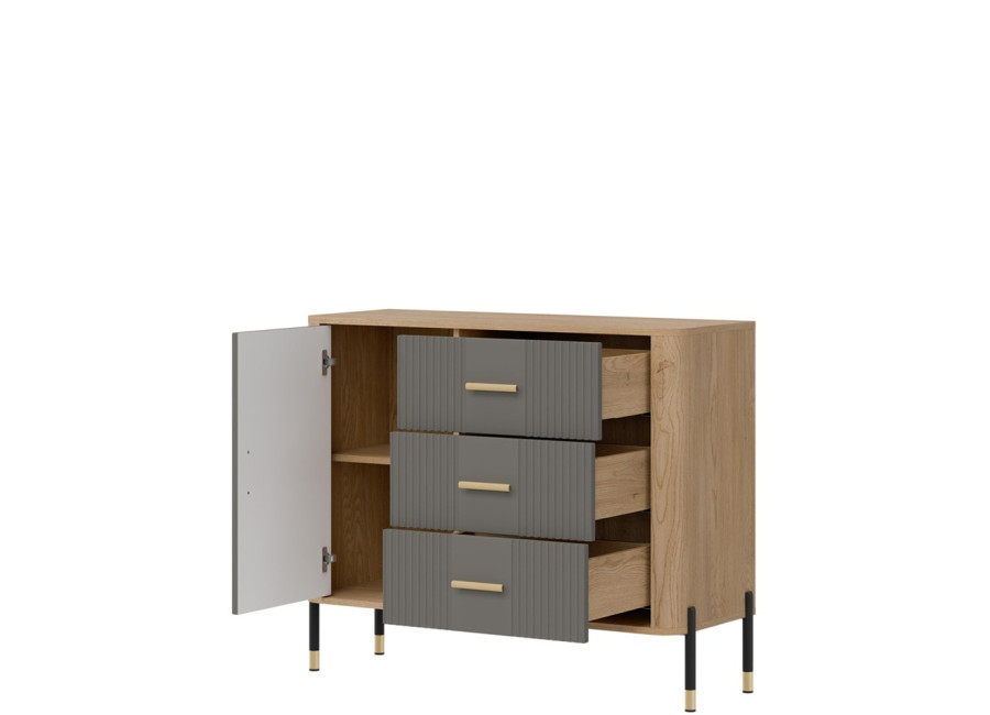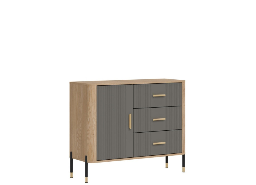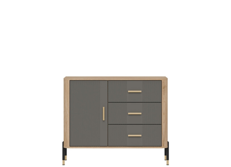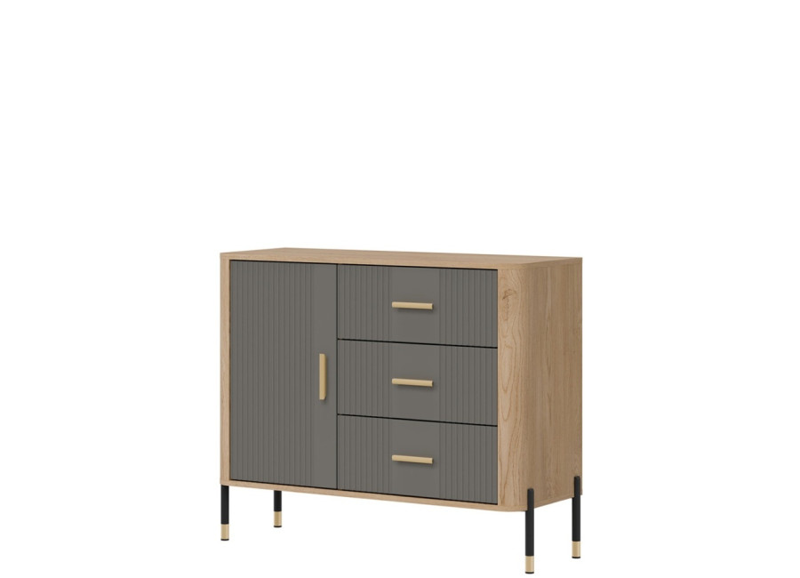 Komoda DANTE prináša dokonalé spojenie moderného dizajnu a praktického využitia. Elegantné úchytky v zlatej alebo čiernej farbe spolu s kovovými nožičkami dodávajú nábytku výnimočný vzhľad vhodný do moderných aj industriálnych interiérov. Vďaka trom zásuvkám a uzatvárateľnej skrinke poskytuje dostatok úložného priestoru, je ideálnou voľbou pre každého, kto hľadá štýlovú a funkčnú komodu do domácnosti či kancelárie.