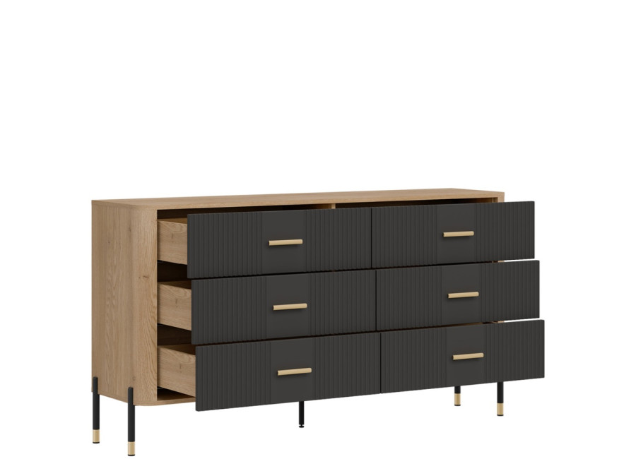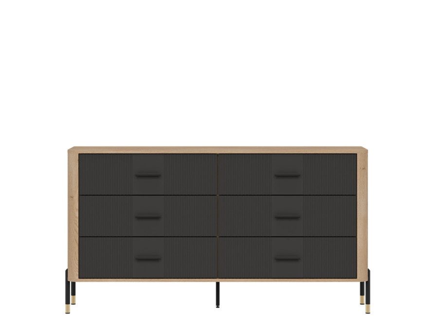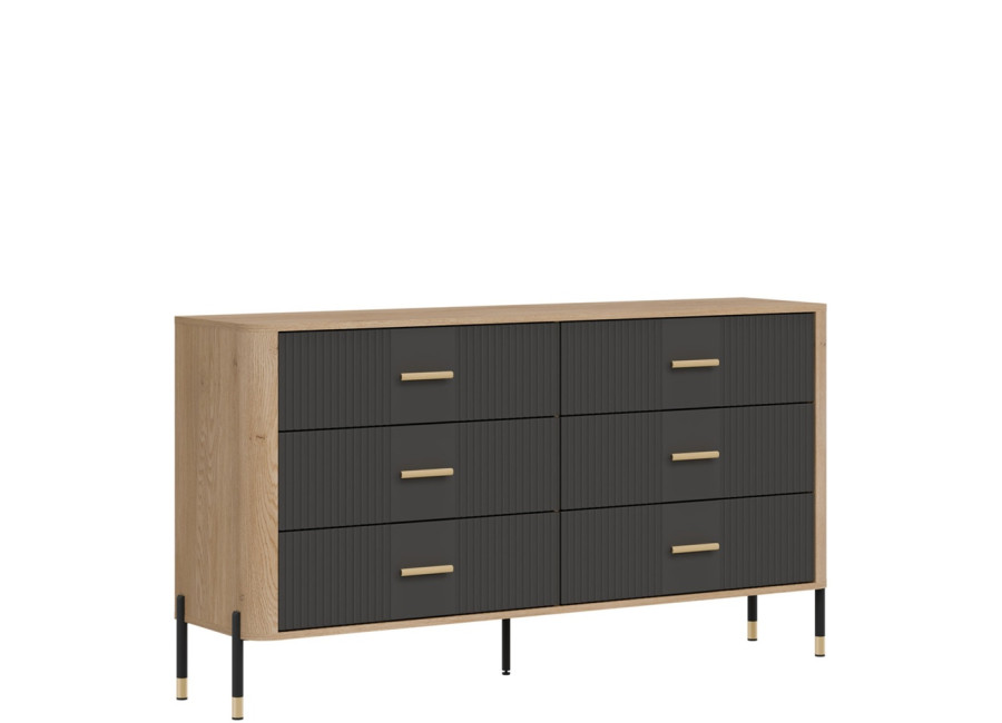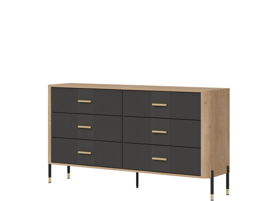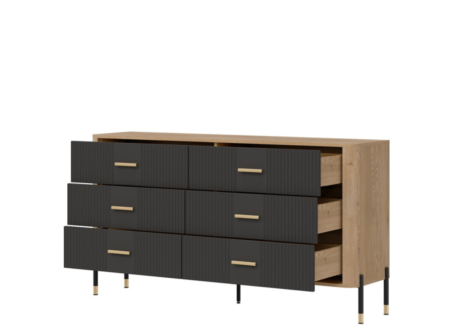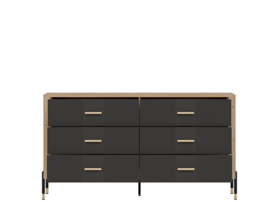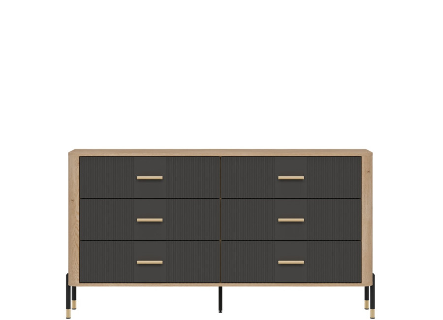 Komoda DANTE prináša dokonalé spojenie moderného dizajnu a praktického využitia. Elegantné úchytky v zlatej alebo čiernej farbe spolu s kovovými nožičkami dodávajú nábytku výnimočný vzhľad vhodný do moderných aj industriálnych interiérov. Vďaka šiestim zásuvkám poskytuje dostatok úložného priestoru, je ideálnou voľbou pre každého, kto hľadá štýlovú a funkčnú komodu do domácnosti či kancelárie.