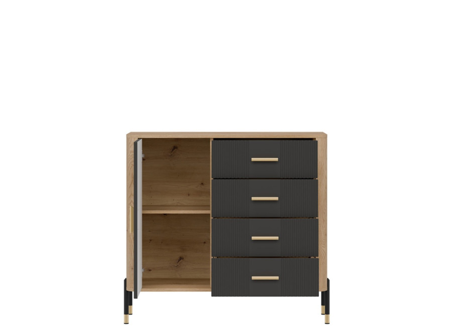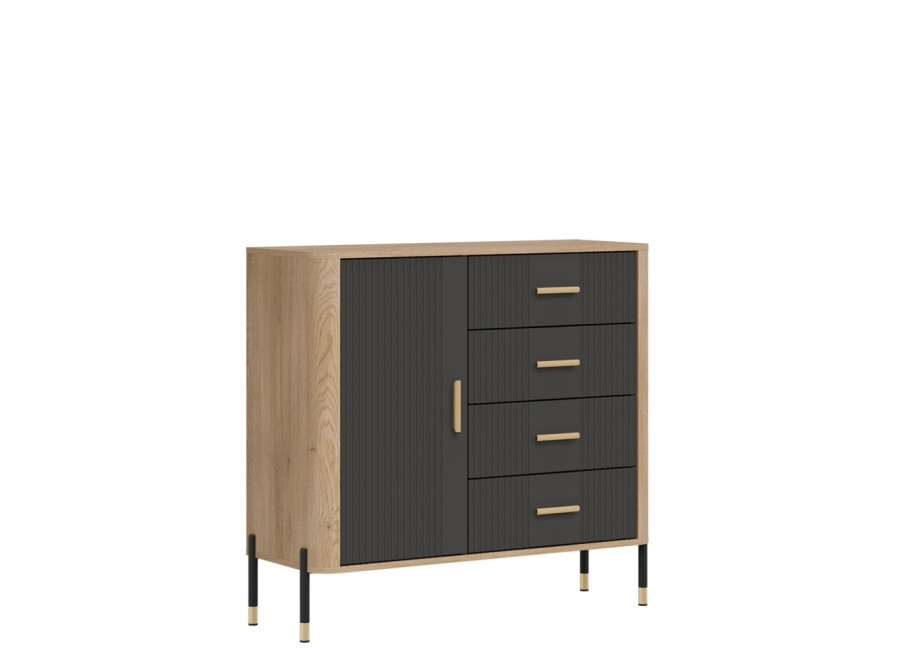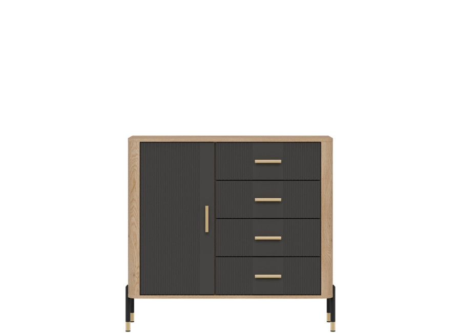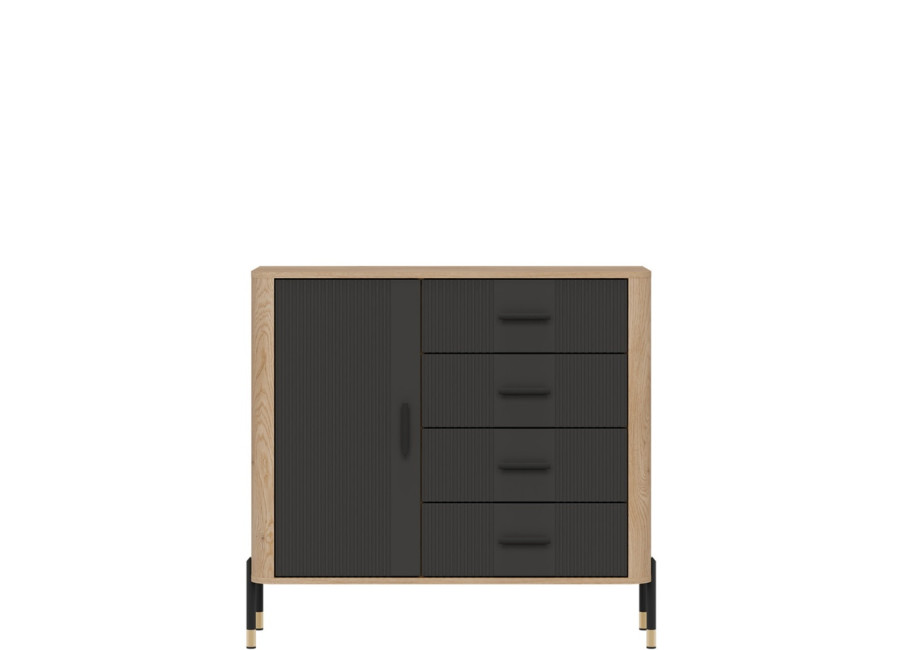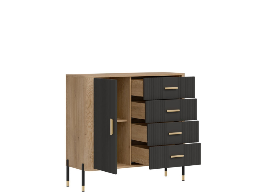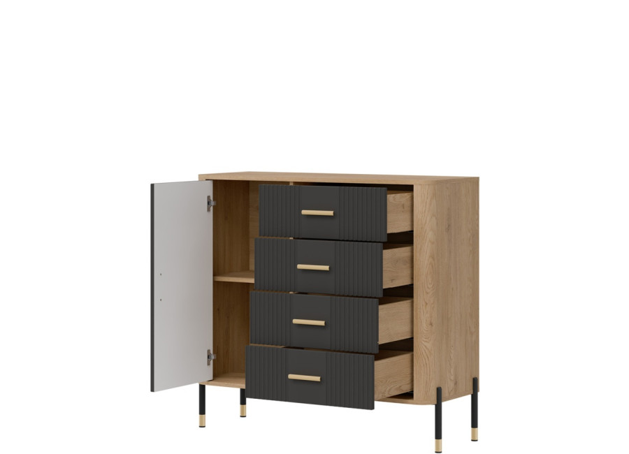 Komoda DANTE prináša dokonalé spojenie moderného dizajnu a praktického využitia. Elegantné úchytky v zlatej alebo čiernej farbe spolu s kovovými nožičkami dodávajú nábytku výnimočný vzhľad vhodný do moderných aj industriálnych interiérov. Vďaka štyrom priestranným zásuvkám a uzatvárateľnej skrinke poskytuje dostatok úložného priestoru, je ideálnou voľbou pre každého, kto hľadá štýlovú a funkčnú komodu do domácnosti či kancelárie.