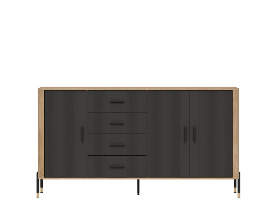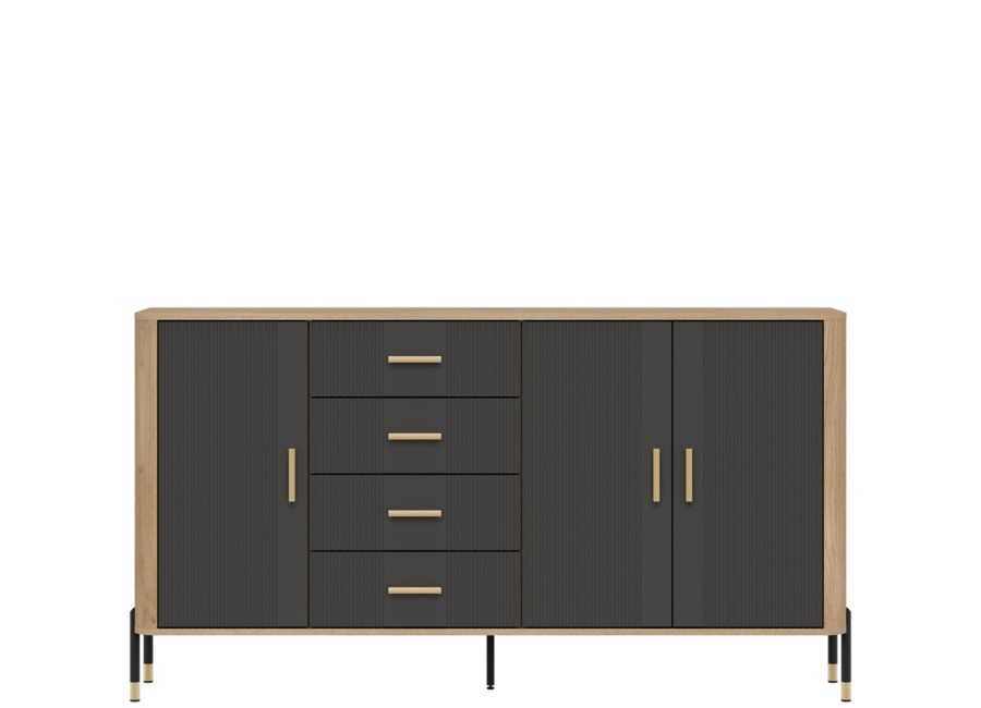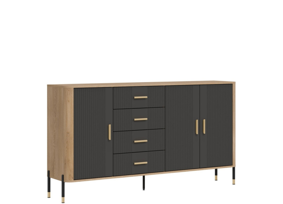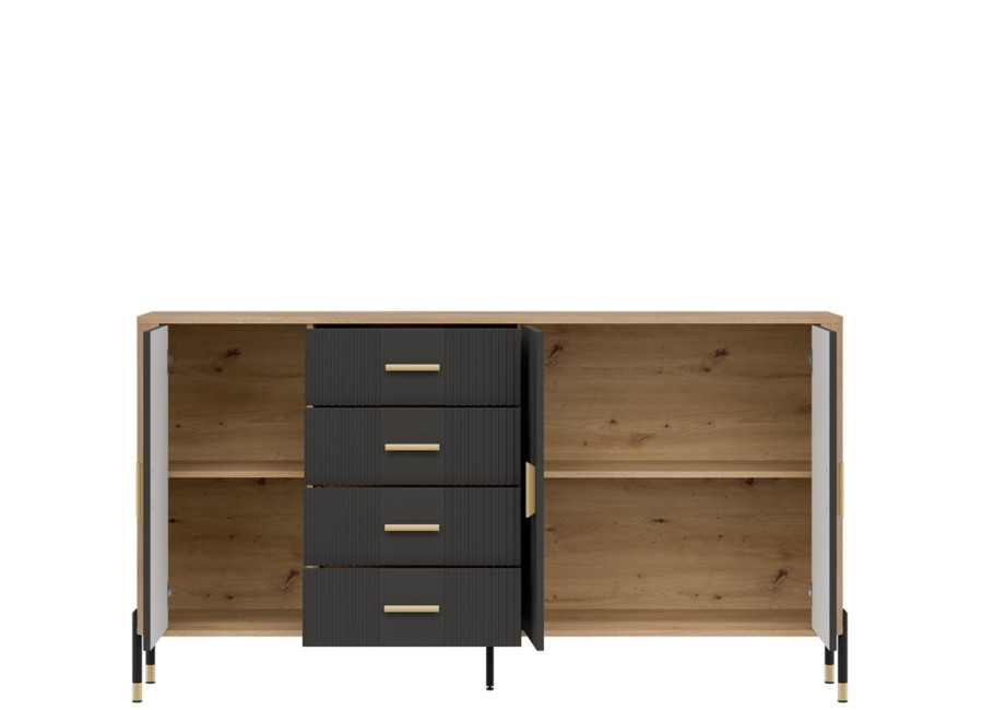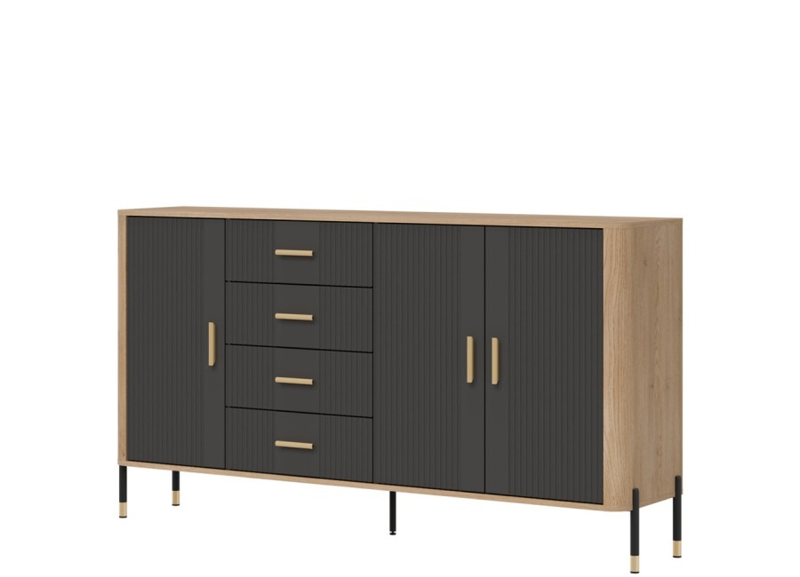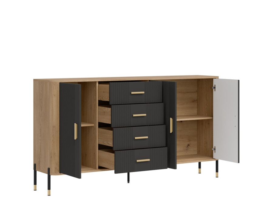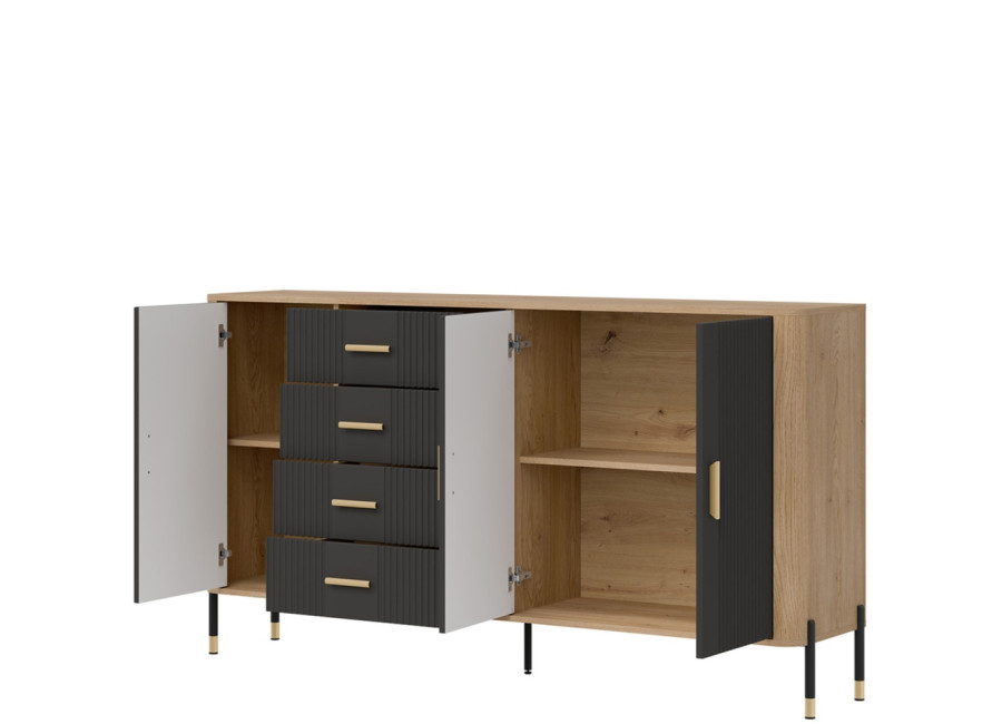 Komoda DANTE prináša dokonalé spojenie moderného dizajnu a praktického využitia. Elegantné úchytky v zlatej alebo čiernej farbe spolu s kovovými nožičkami dodávajú nábytku výnimočný vzhľad vhodný do moderných aj industriálnych interiérov. Vďaka štyrom zásuvkám a priestorom za dvierkami poskytuje dostatok úložného priestoru, je ideálnou voľbou pre každého, kto hľadá štýlovú a funkčnú komodu do domácnosti či kancelárie.