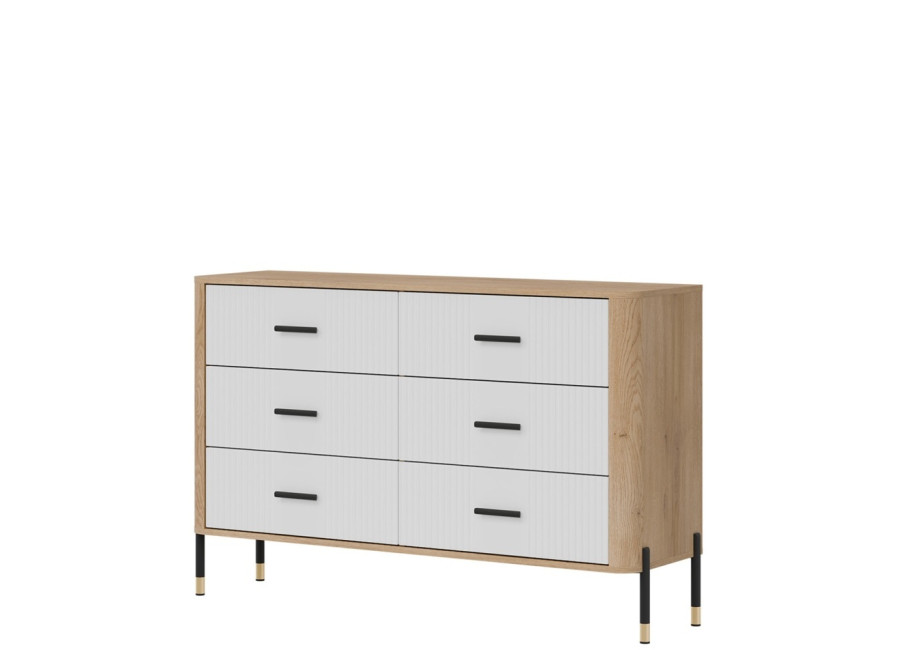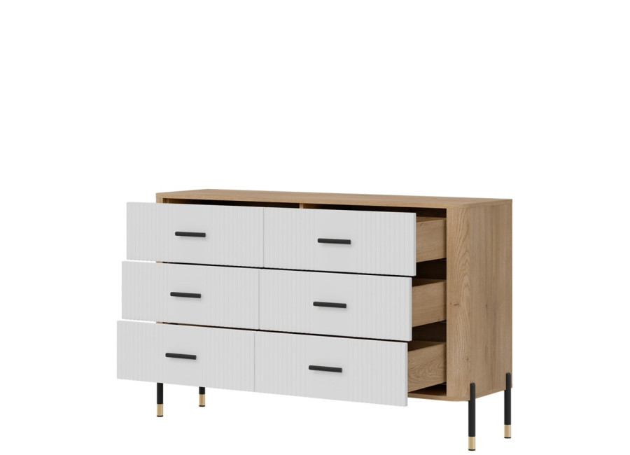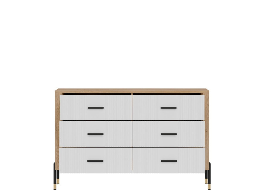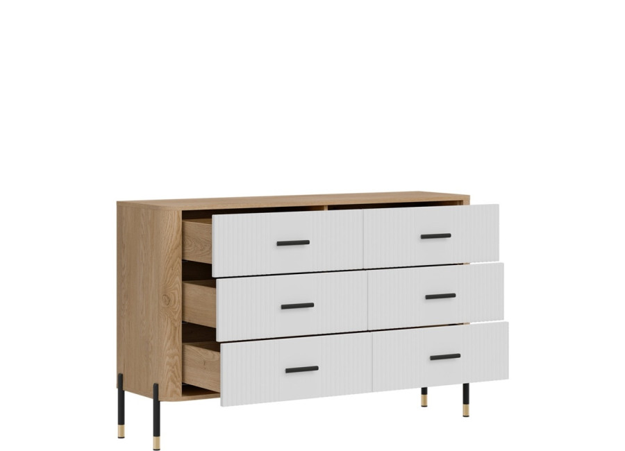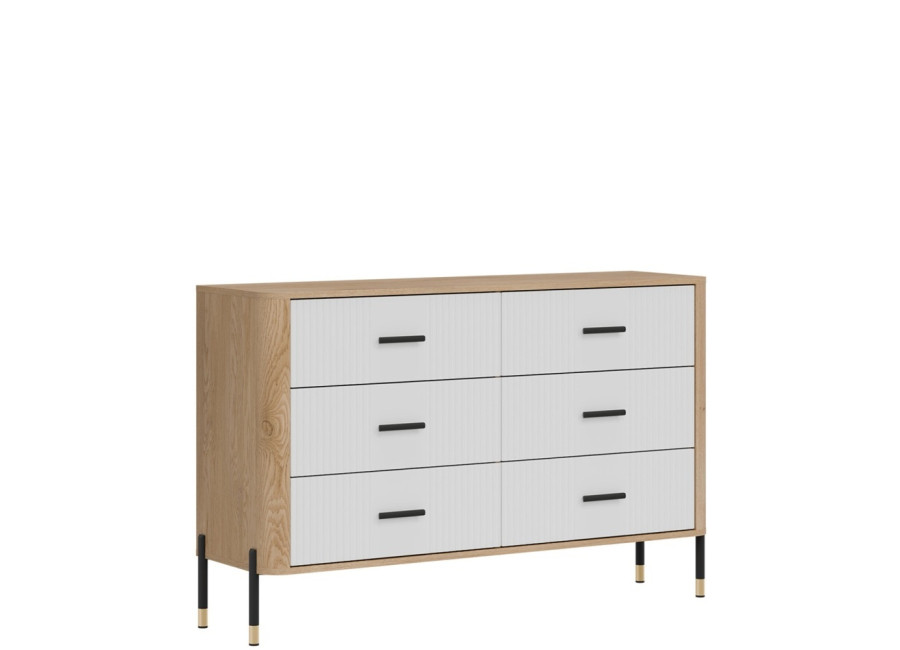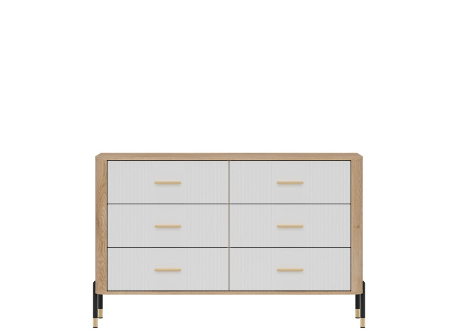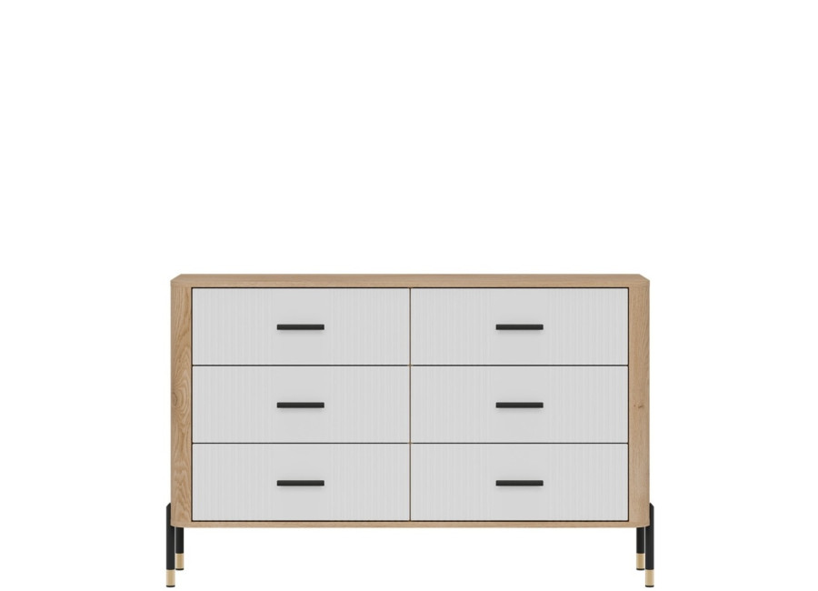 Komoda DANTE biela prináša dokonalé spojenie moderného dizajnu a praktického využitia. Elegantné úchytky v zlatej alebo čiernej farbe spolu s kovovými nožičkami dodávajú nábytku výnimočný vzhľad vhodný do moderných aj industriálnych interiérov. Vďaka šiestim zásuvkám poskytuje dostatok úložného priestoru, je ideálnou voľbou pre každého, kto hľadá štýlovú a funkčnú komodu do domácnosti či kancelárie.