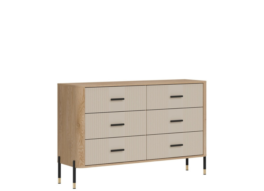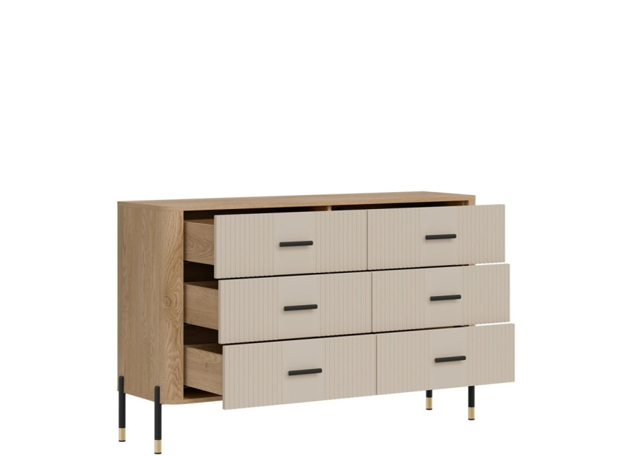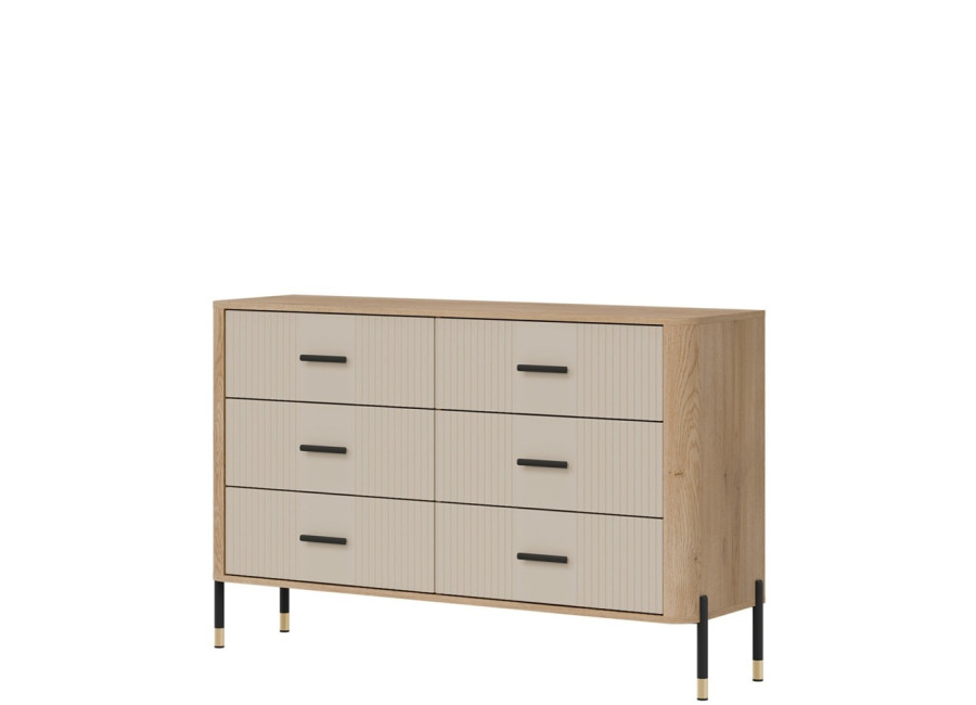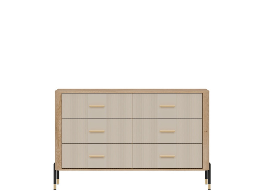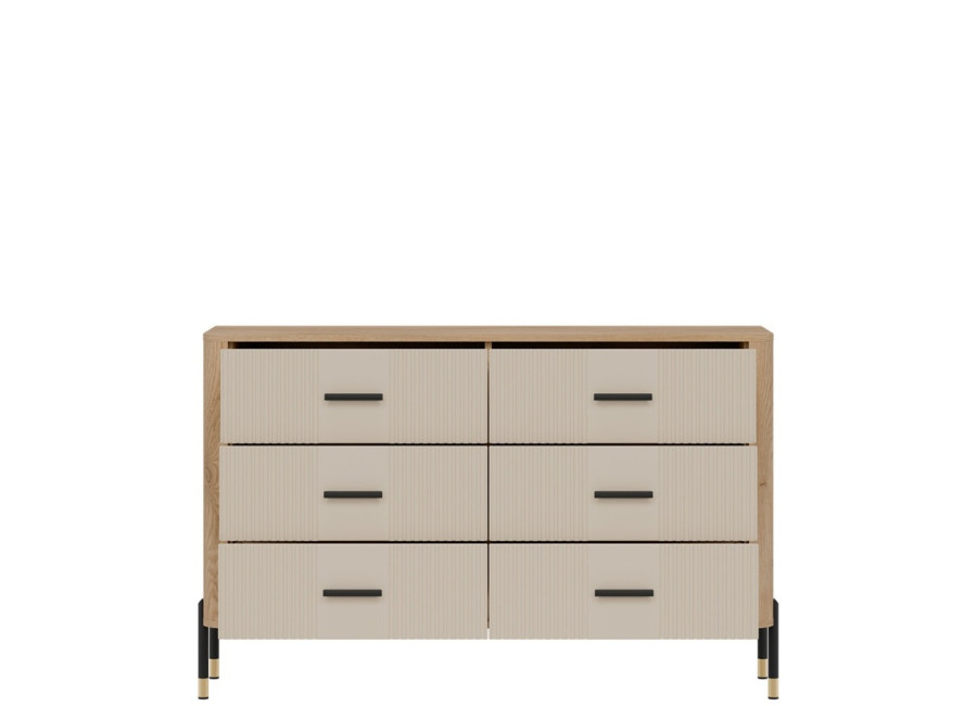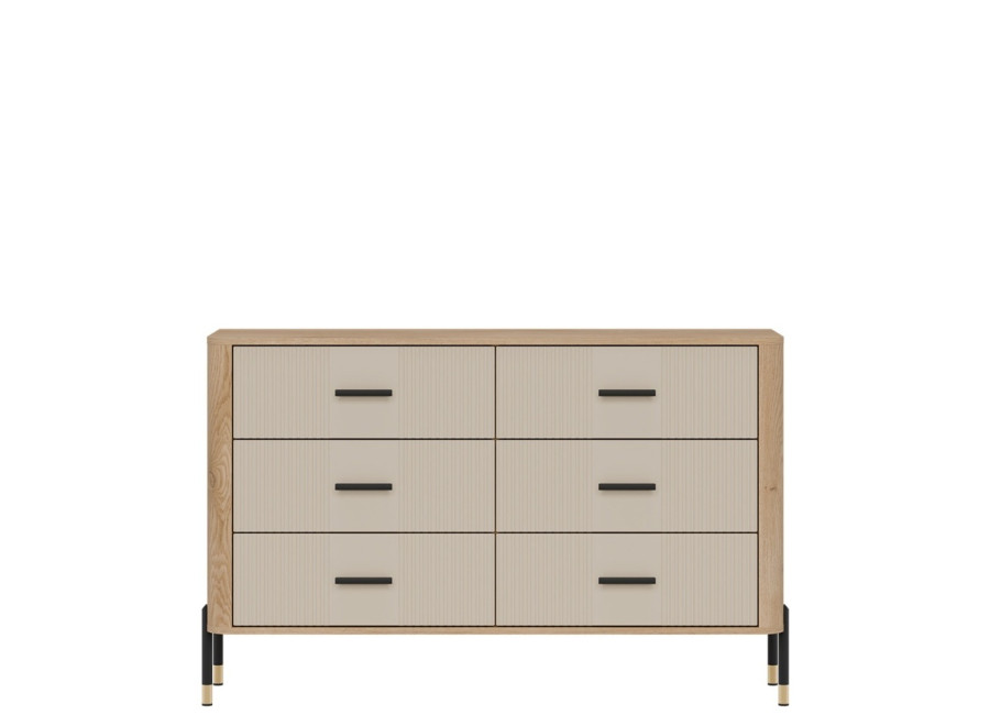 Komoda DANTE prináša dokonalé spojenie moderného dizajnu a praktického využitia. Elegantné úchytky v zlatej alebo čiernej farbe spolu s kovovými nožičkami dodávajú nábytku výnimočný vzhľad vhodný do moderných aj industriálnych interiérov. Vďaka šiestim zásuvkám poskytuje dostatok úložného priestoru, je ideálnou voľbou pre každého, kto hľadá štýlovú a funkčnú komodu do domácnosti či kancelárie.