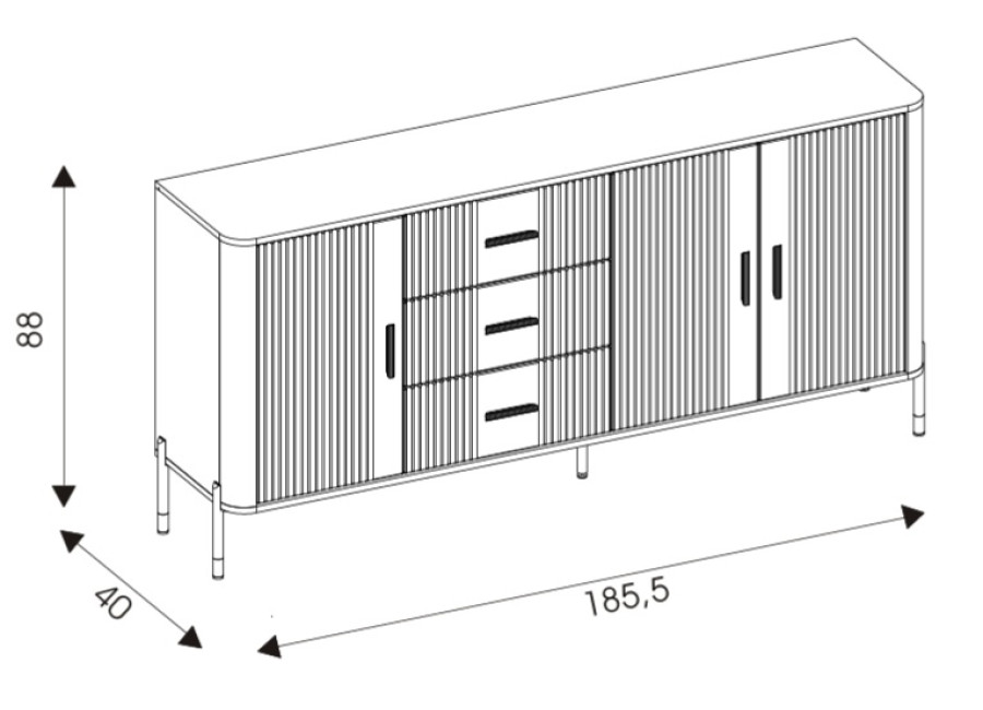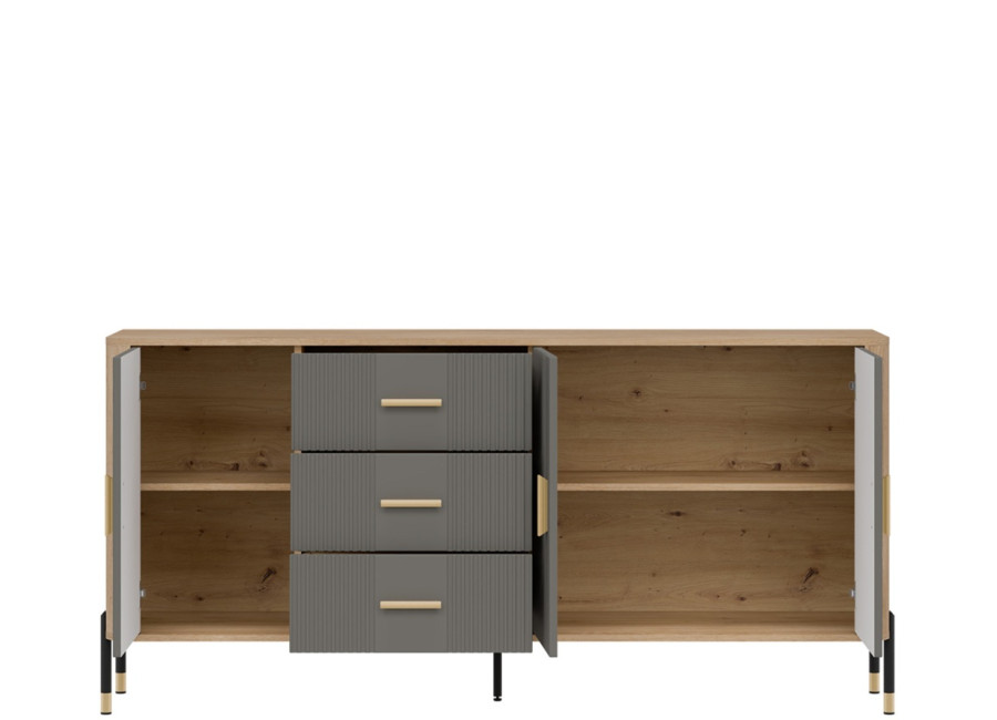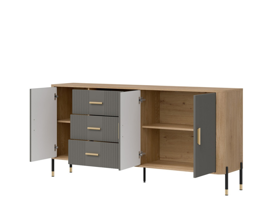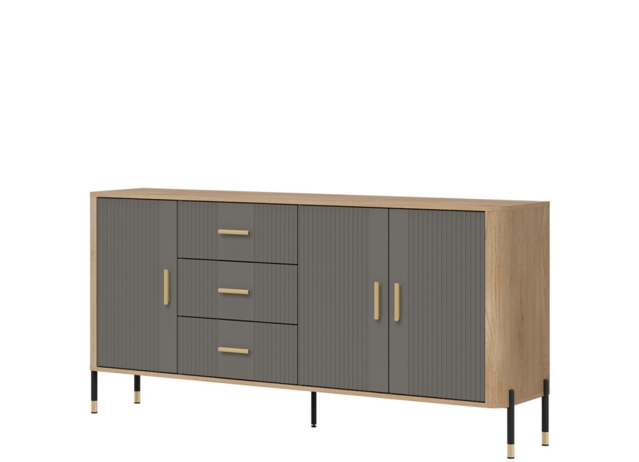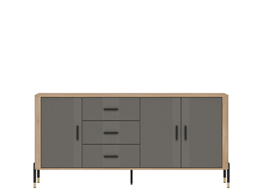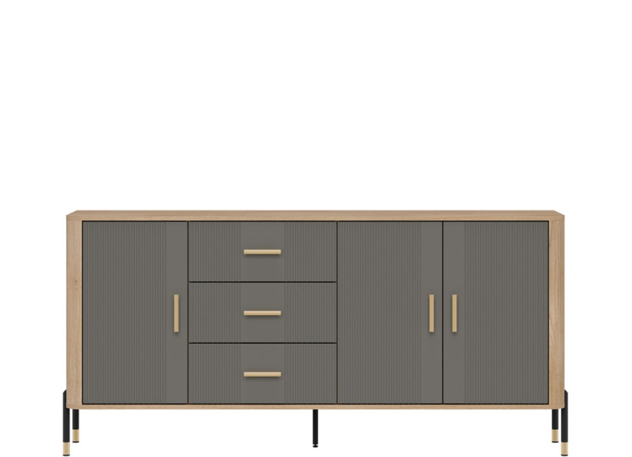 Komoda DANTE prináša dokonalé spojenie moderného dizajnu a praktického využitia. Elegantné úchytky v zlatej alebo čiernej farbe spolu s kovovými nožičkami dodávajú nábytku výnimočný vzhľad vhodný do moderných aj industriálnych interiérov. Vďaka trom zásuvkám a úložným priestorom za dvierkami, poskytuje dostatok úložného priestoru, je ideálnou voľbou pre každého, kto hľadá štýlovú a funkčnú komodu do domácnosti či kancelárie.