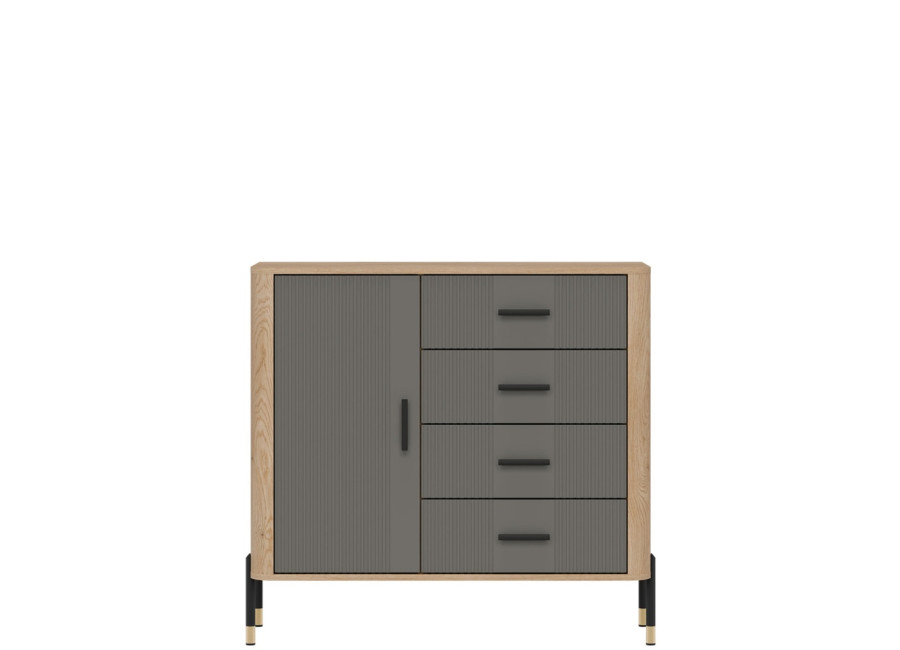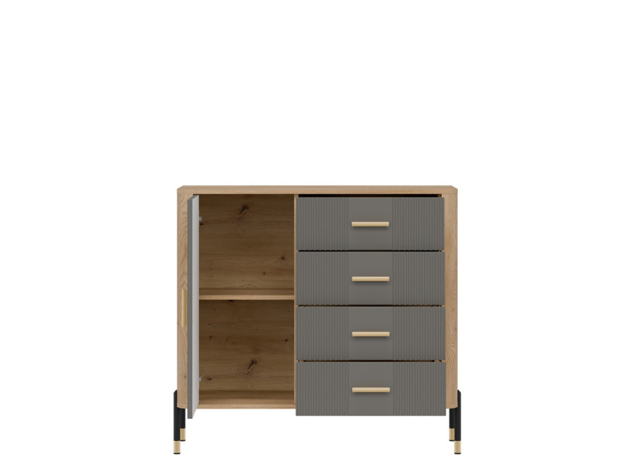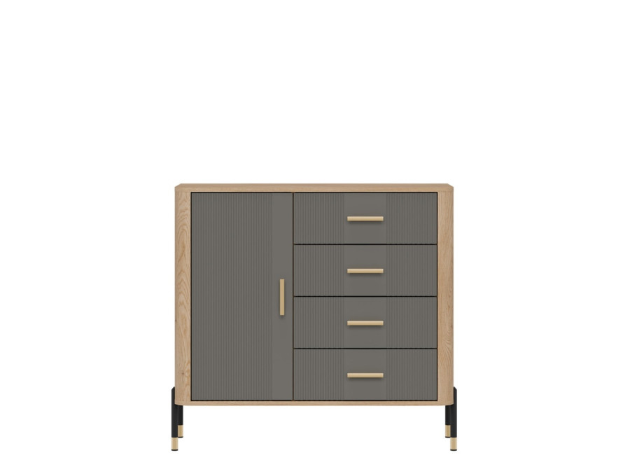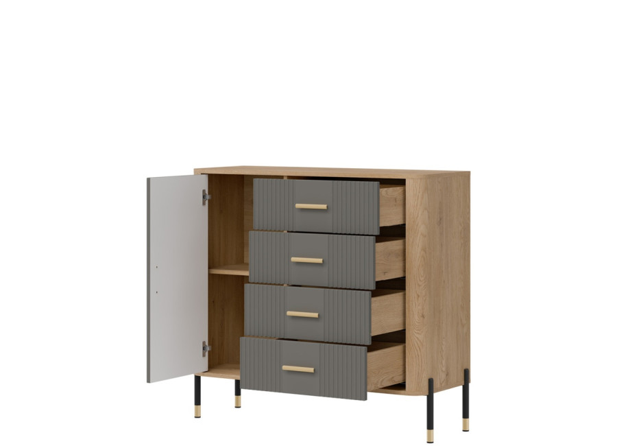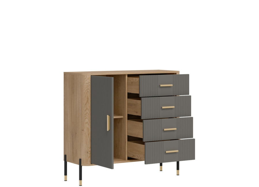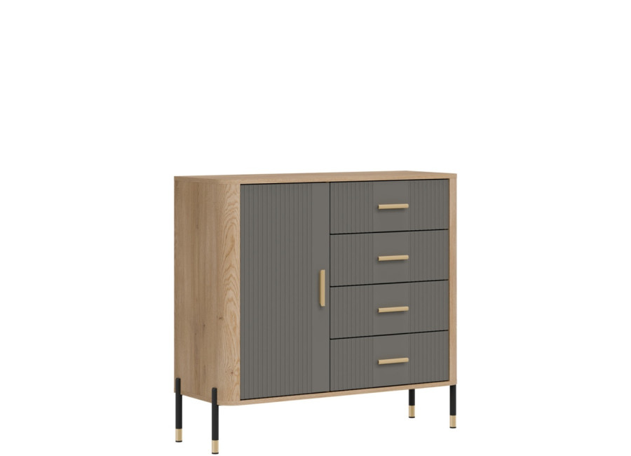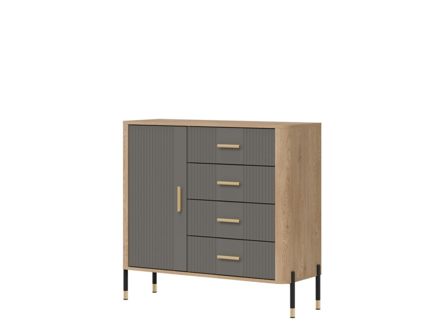 Komoda DANTE prináša dokonalé spojenie moderného dizajnu a praktického využitia. Elegantné úchytky v zlatej alebo čiernej farbe spolu s kovovými nožičkami dodávajú nábytku výnimočný vzhľad vhodný do moderných aj industriálnych interiérov. Vďaka štyrom zásuvkám a uzatvárateľnej skrinke poskytuje dostatok úložného priestoru, je ideálnou voľbou pre každého, kto hľadá štýlovú a funkčnú komodu do domácnosti či kancelárie.