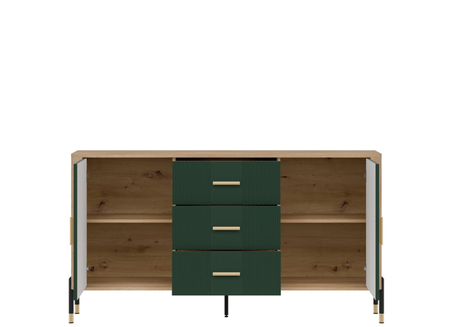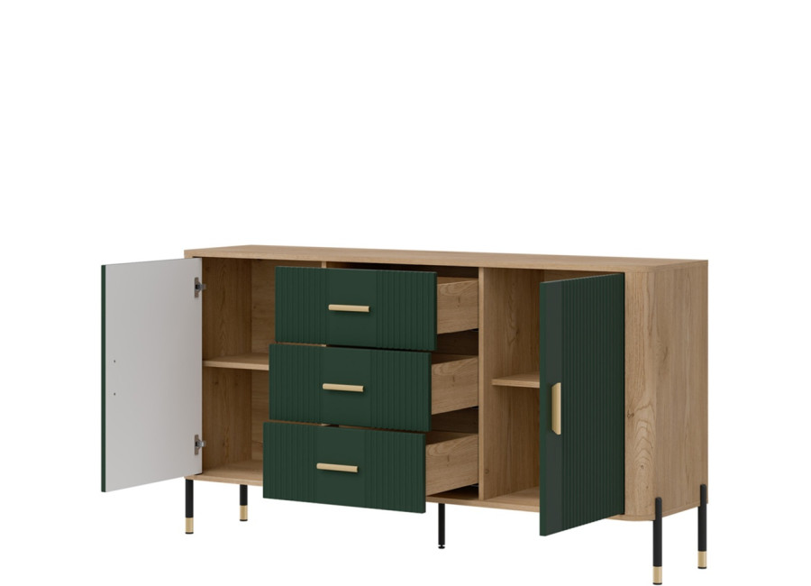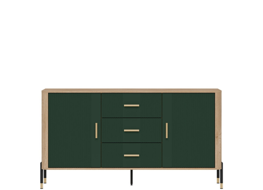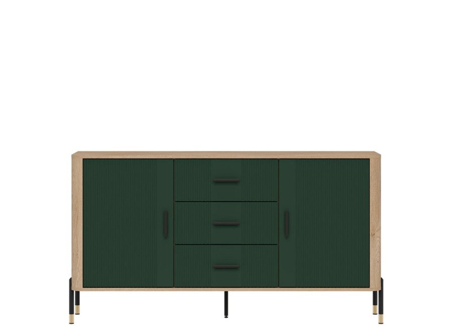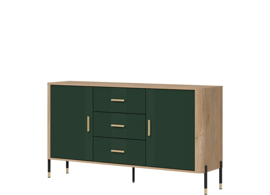 Komoda DANTE prináša dokonalé spojenie moderného dizajnu a praktického využitia. Elegantné úchytky v zlatej alebo čiernej farbe spolu s kovovými nožičkami dodávajú nábytku výnimočný vzhľad vhodný do moderných aj industriálnych interiérov. Vďaka trom zásuvkám a úložným priestorom za dvierkami, poskytuje dostatok úložného priestoru, je ideálnou voľbou pre každého, kto hľadá štýlovú a funkčnú komodu do domácnosti či kancelárie.