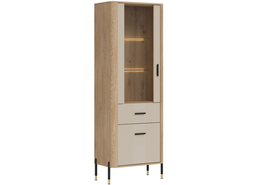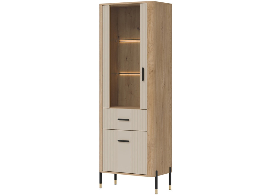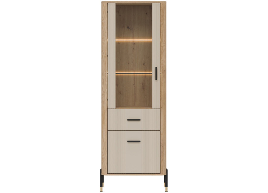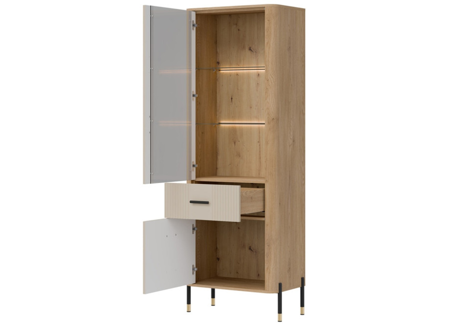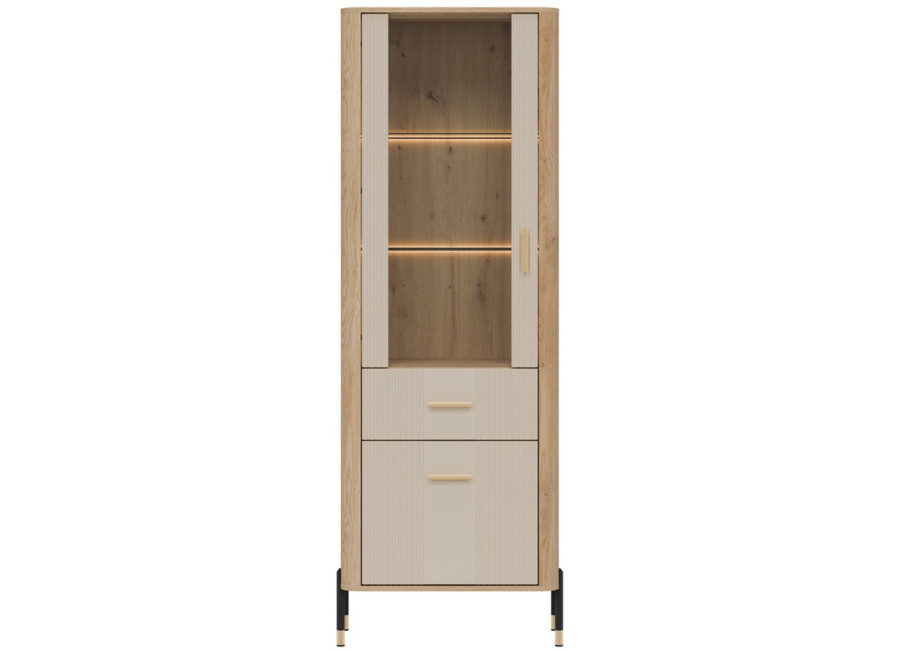 Vitrína DANTE je elegantným doplnkom obývacej izby. Horná presklená časť poskytuje priestor na vystavenie fotografii, pohárov alebo porcelánu. Dolná časť ukrýva priestrannú skrinku a zásuvku na rôzne predmety. Zlaté alebo čierne úchytky a štíhle kovové nožičky dodávajú celku ľahkosť a exkluzívny charakter.