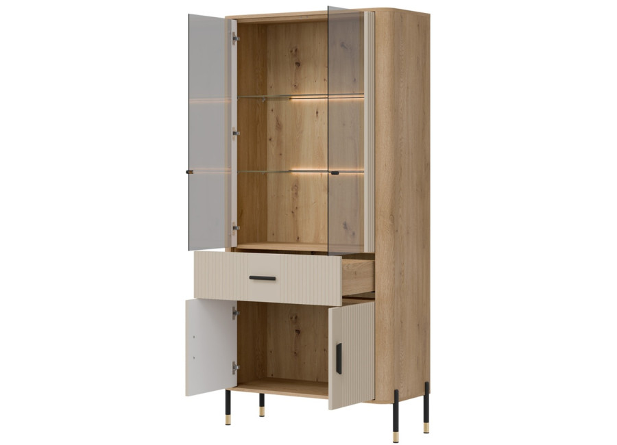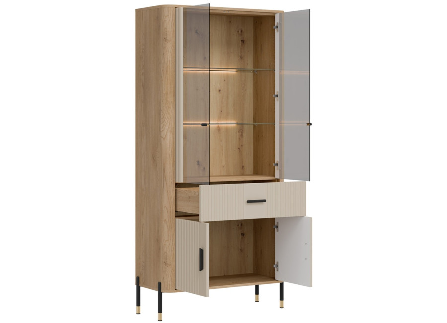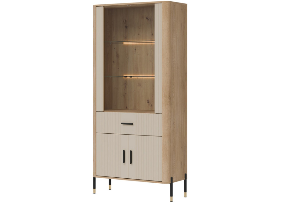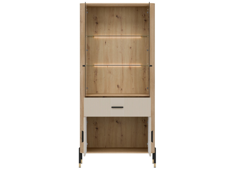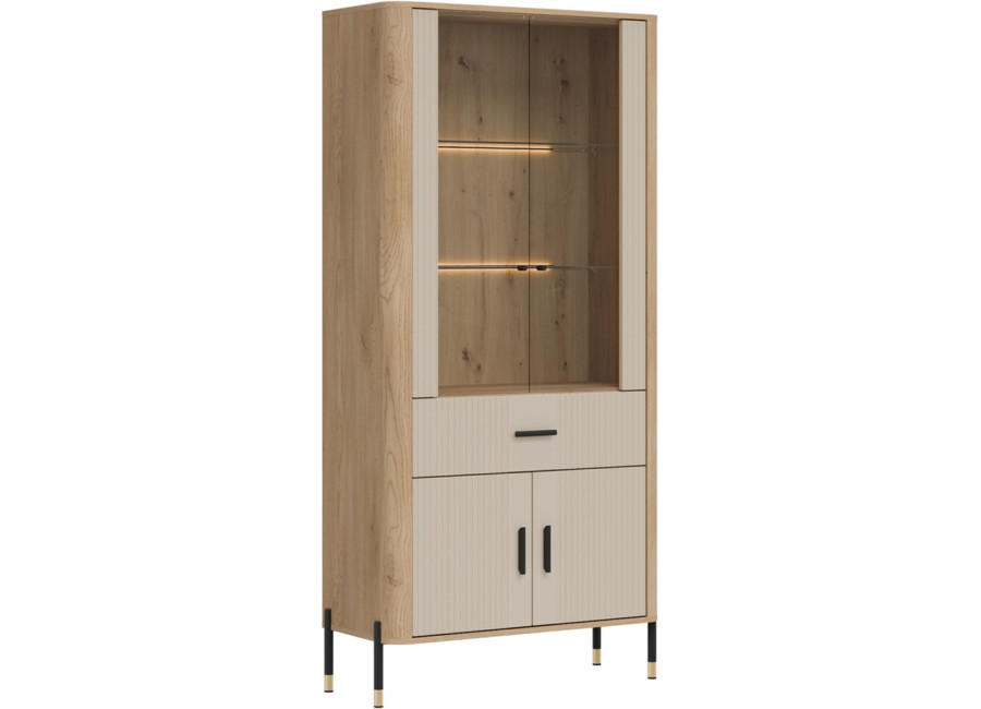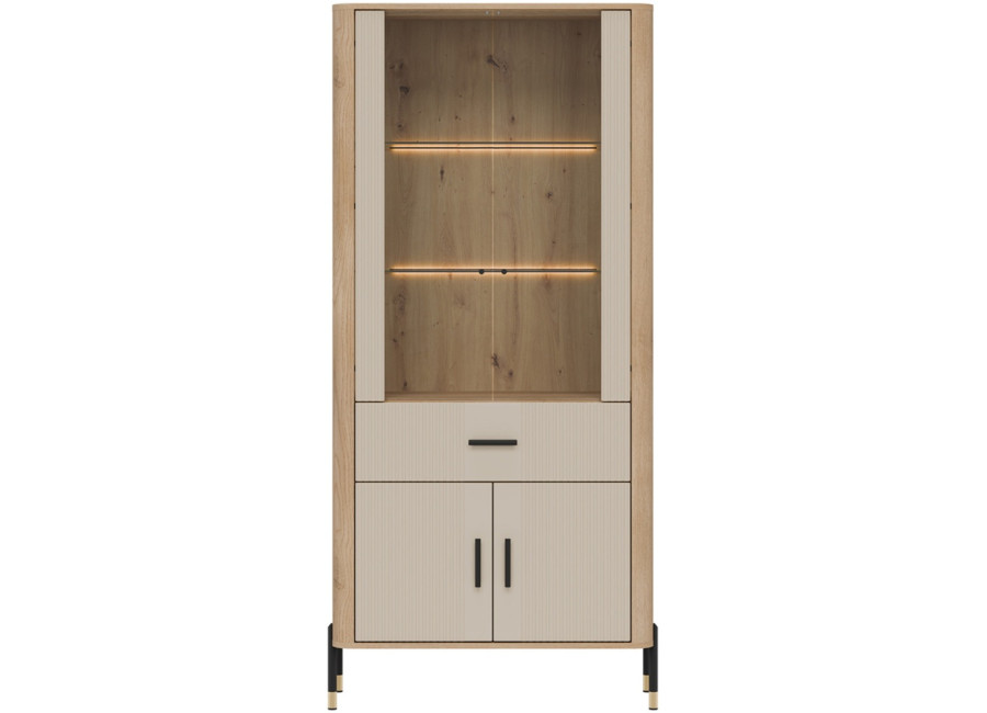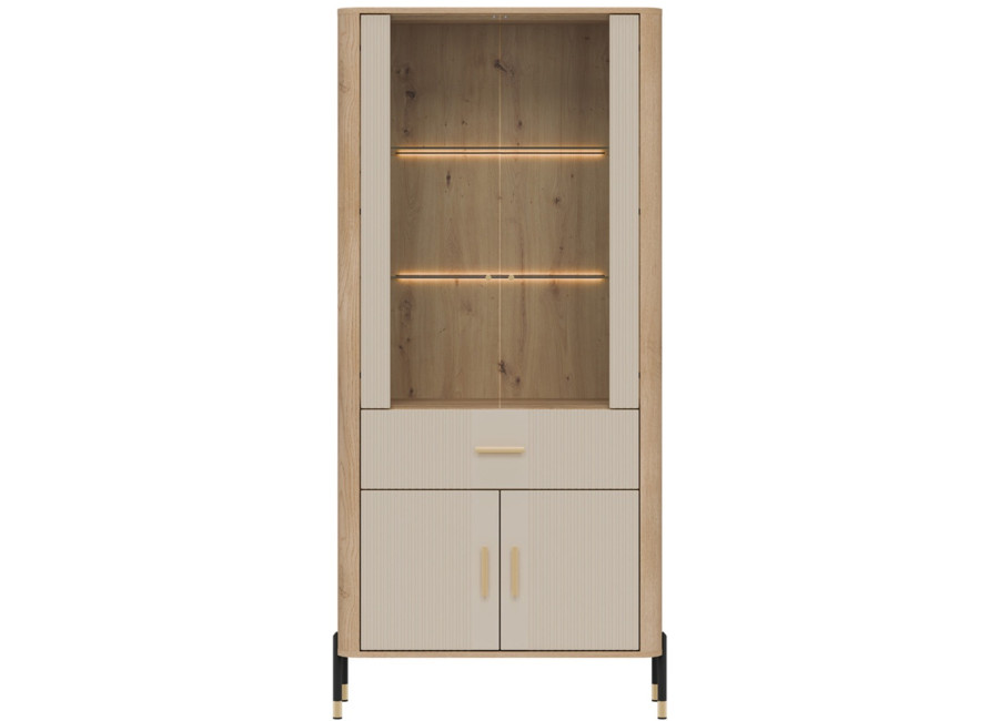 Vitrína DANTE je elegantným doplnkom obývacej izby. Horná presklená časť poskytuje priestor na vystavenie fotografii, pohárov alebo porcelánu. Dolná časť ukrýva priestrannú dvojdverovú skrinku a zásuvku na rôzne predmety. Zlaté alebo čierne úchytky a štíhle kovové nožičky dodávajú celku ľahkosť a exkluzívny charakter.