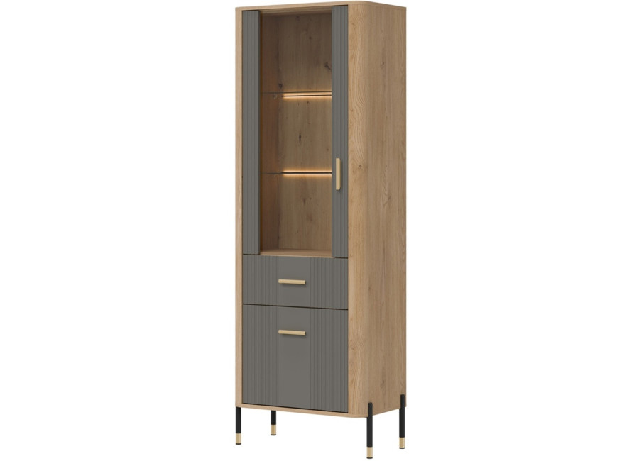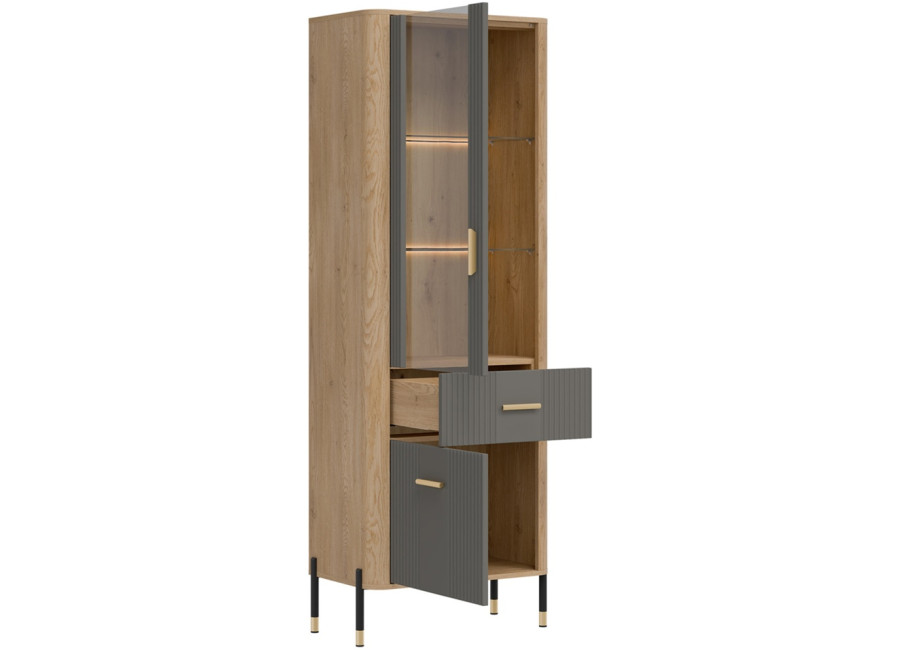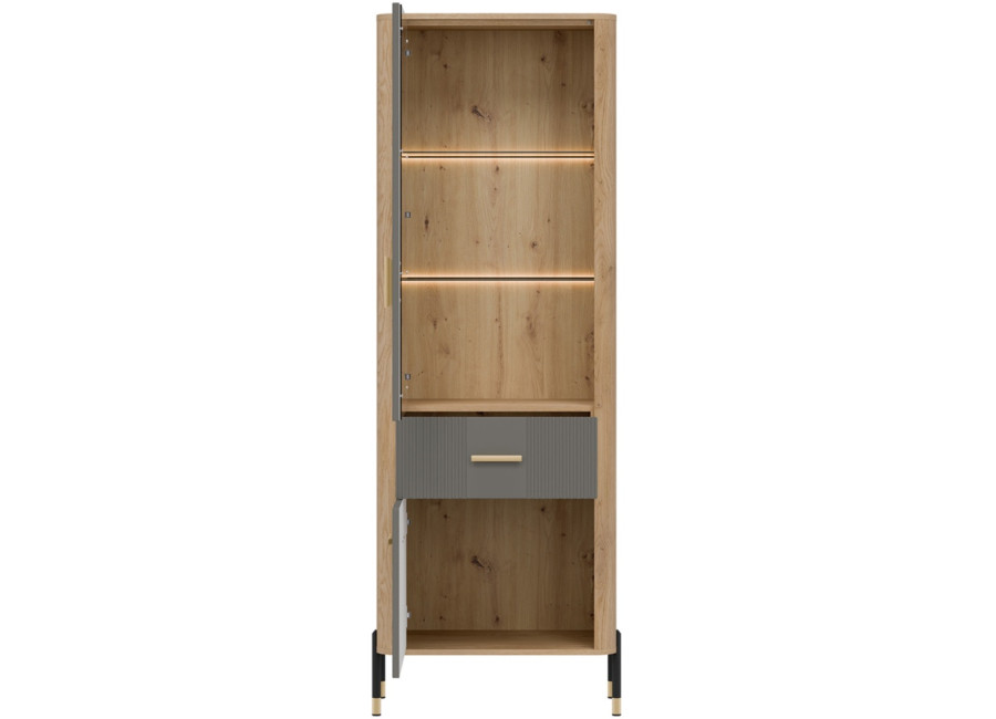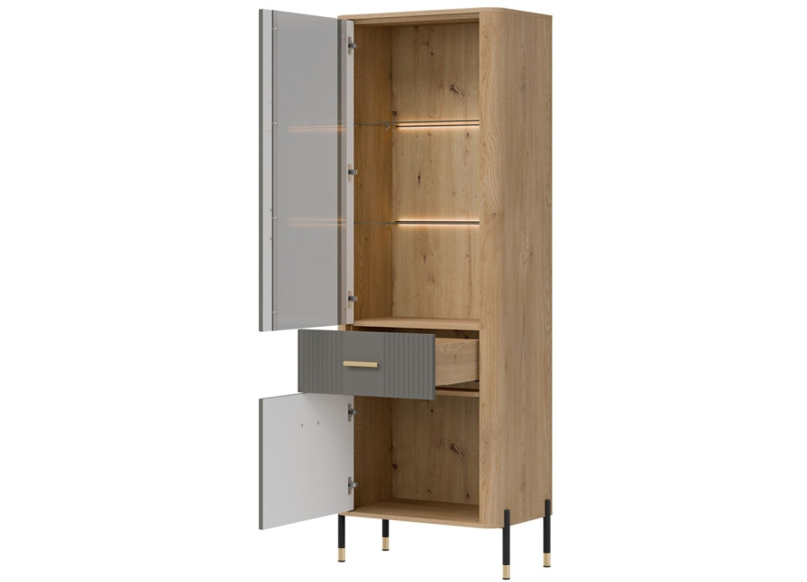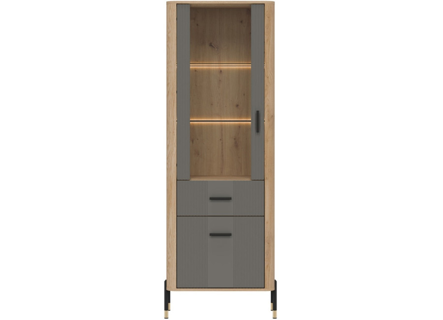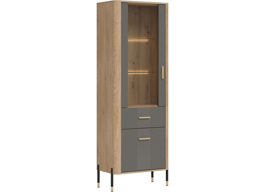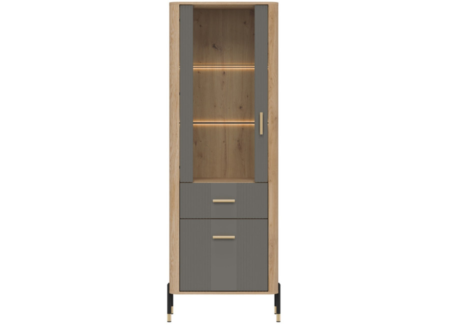 Vitrína DANTE je elegantným doplnkom obývacej izby. Horná presklená časť poskytuje priestor na vystavenie fotografii, pohárov alebo porcelánu. Dolná časť ukrýva priestrannú skrinku a zásuvku na rôzne predmety. Zlaté alebo čierne úchytky a štíhle kovové nožičky dodávajú celku ľahkosť a exkluzívny charakter.