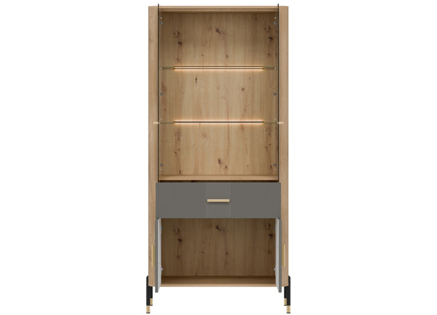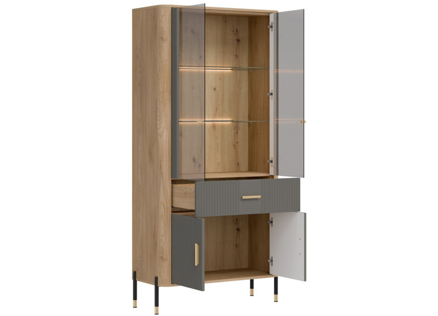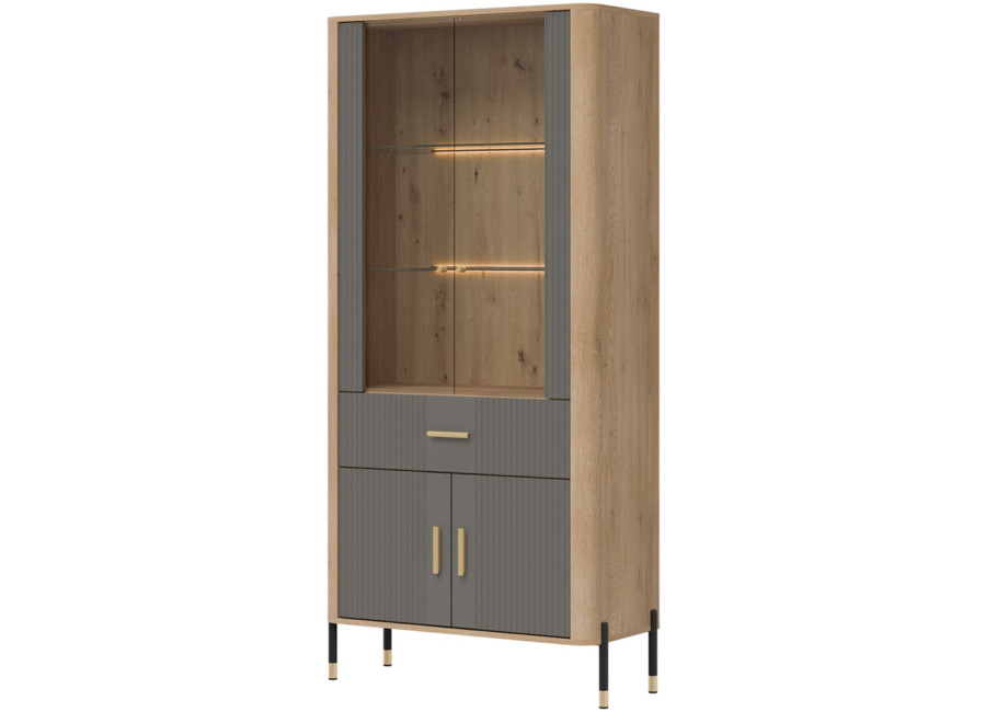 Vitrína DANTE je elegantným doplnkom obývacej izby. Horná presklená časť poskytuje priestor na vystavenie fotografii, pohárov alebo porcelánu. Dolná časť ukrýva priestrannú dvojdverovú skrinku a zásuvku na rôzne predmety. Zlaté alebo čierne úchytky a štíhle kovové nožičky dodávajú celku ľahkosť a exkluzívny charakter.