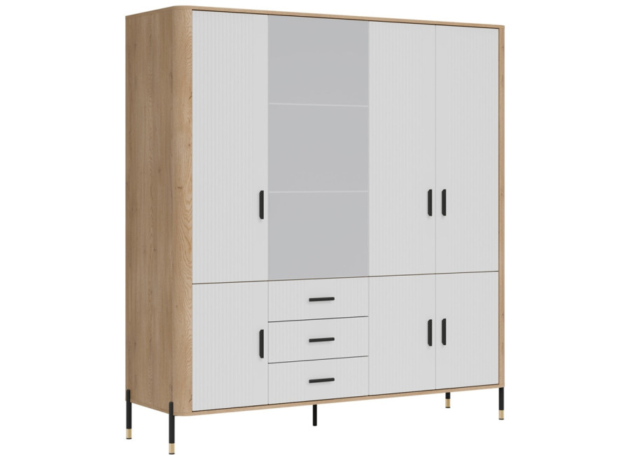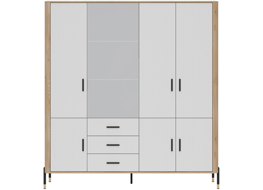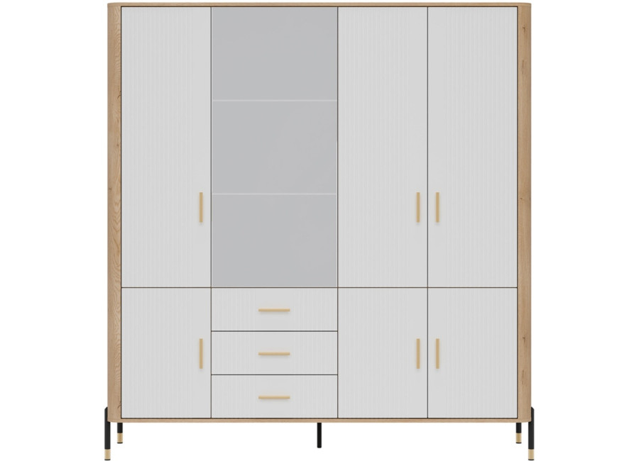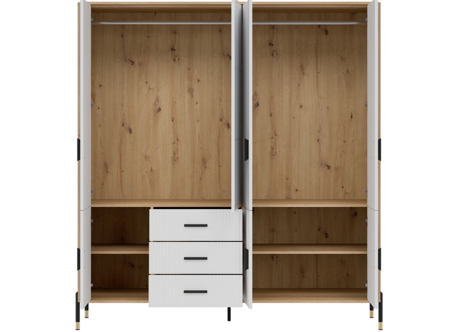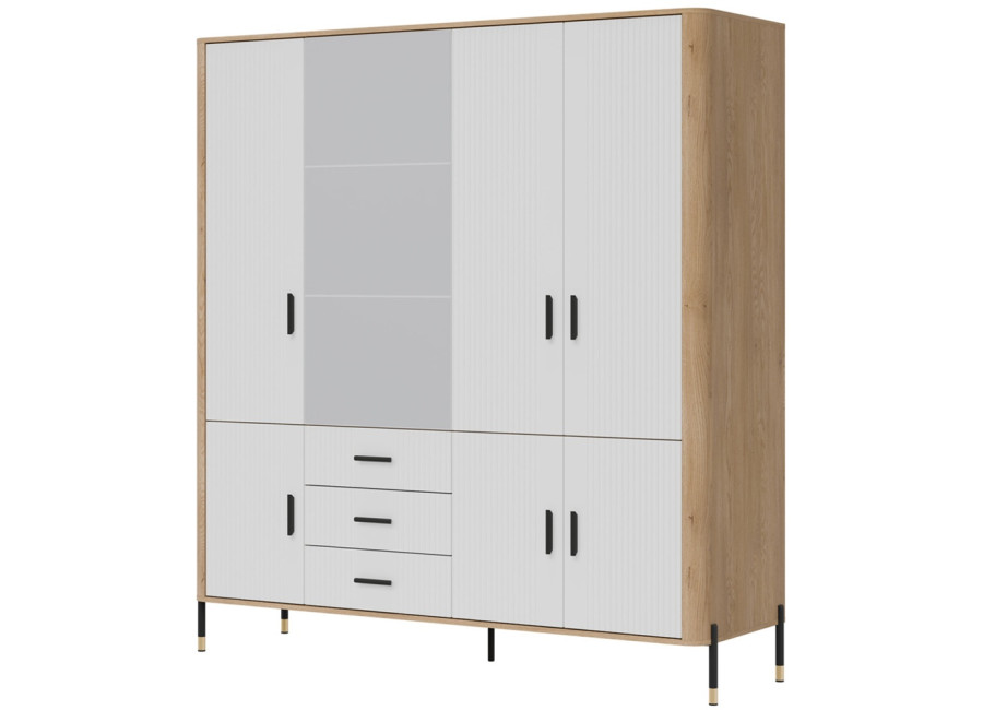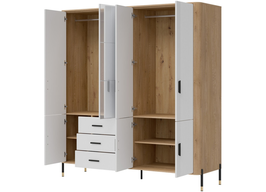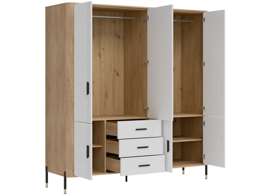 Šatníkovo-policová skriňa DANTE v bielom vyhotovení predstavuje kombináciu moderného dizajnu a funkčnosti. Šatníkovú časť zakrývajú dvere. Spodná policová časť skrine je vybavená tromi dvierkami a tromi praktickými zásuvkami, ktoré sú nenahraditeľné pre prehľadnú organizáciu všetkých drobností.