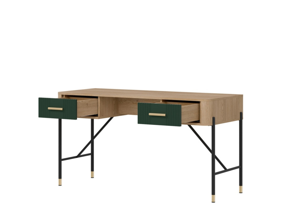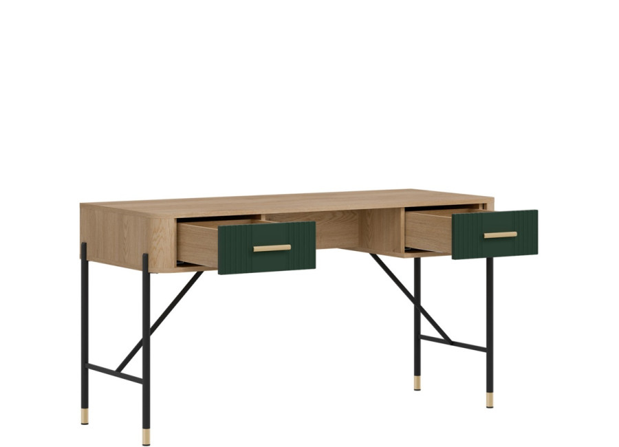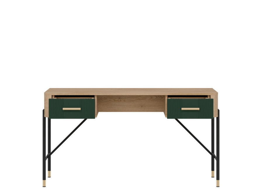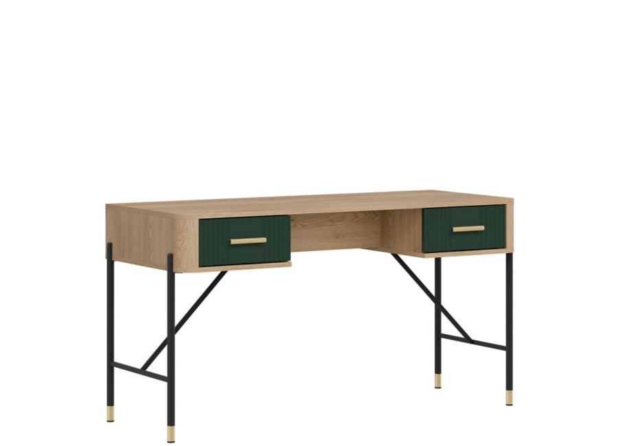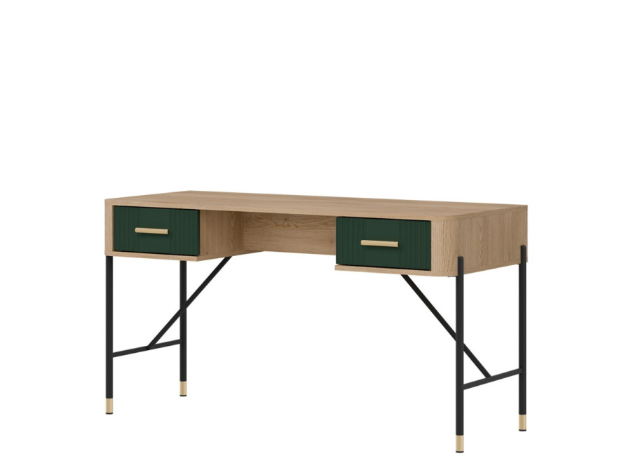 Písací stolík Dante DT23 vyniká moderným dizajnom a detailami. Či už zariaďujete elegantnú kanceláriu, domácu pracovňu alebo študentský kútik, tento kúsok do vášho interiéru vnesie výnimočný štýl. Jeho výrazný dizajn kombinuje odtieň dreva s farebnými variantmi čiel zásuviek, ktoré doplníte zlatými alebo čiernymi úchytkami podľa vlastného vkusu.
