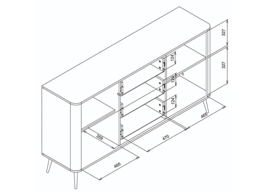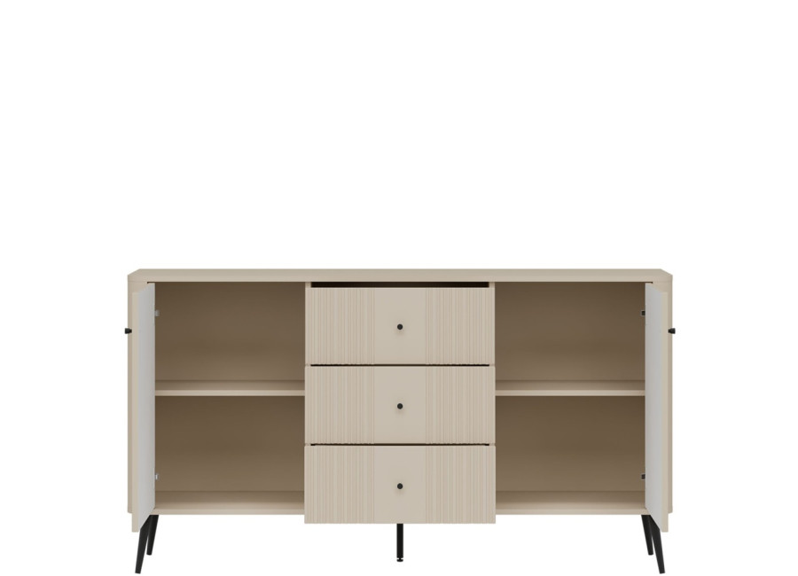 Komoda VIGO 05 skrýva dve priestranné police a tri praktické zásuvky, ktoré hravo pojmú všetko, čo potrebujete mať poruke. Pohodlnú manipuláciu so zásuvkami aj dvierkami zabezpečujú štýlové kovové úchytky. Celkový vzhľad podčiarkujú vysoké kovové nožičky, ktoré komode dodávajú vzdušnosť a navyše vám výrazne uľahčia upratovanie.