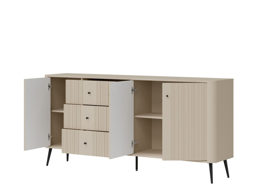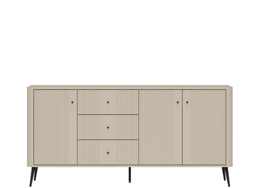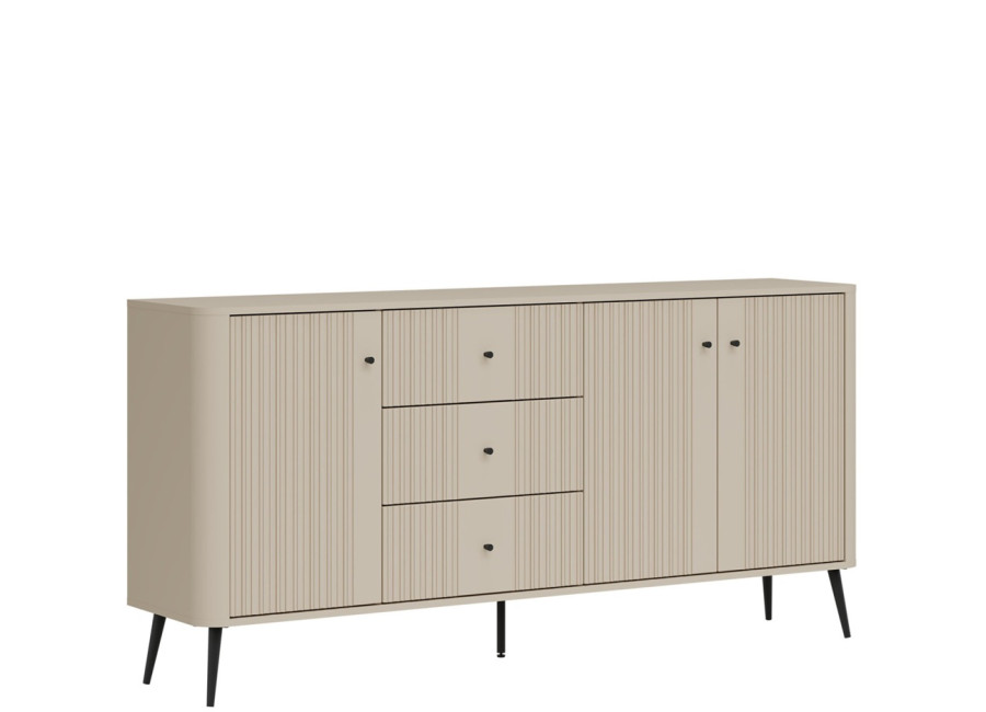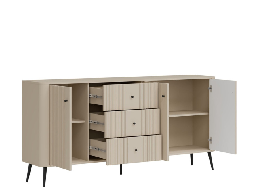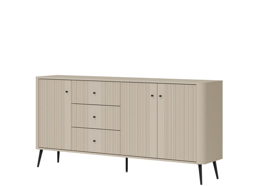 - predné plochy z MDF materiálu v matnej kašmírovej farbe, zdobené jemným zvislým drážkovaním,