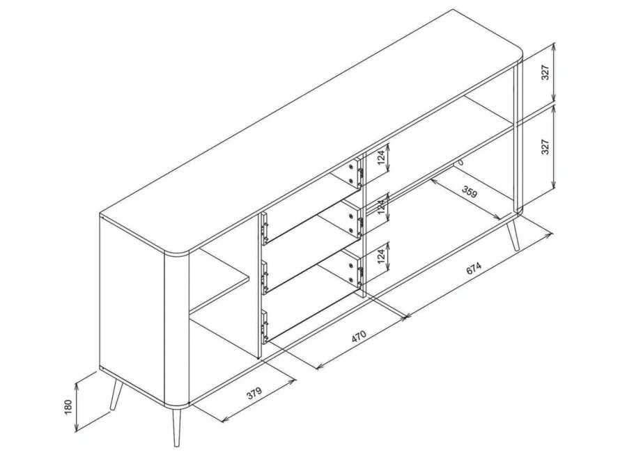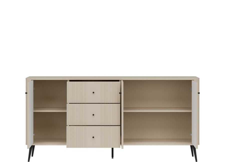 Komoda VIGO 06 je vhodná do väčších obývačiek a priestorov. Za dvierkami nájdete dve praktické police, ktoré dopĺňajú tri priestranné zásuvky. Pohodlnú manipuláciu zaručujú štýlové kovové úchytky, zatiaľ čo vysoké kovové nohy nielenže dodávajú nábytku ľahkosť, ale zároveň maximálne uľahčujú upratovanie podlahy pod komodou.