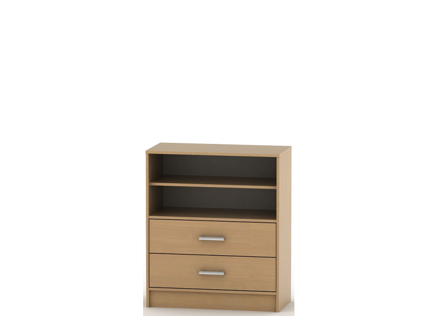 Praktická komoda BETTY BE04-013-00 s dvomi zásuvkami a policovou časťou do domácnosti, pracovne alebo kancelárie. Vnútro komody a zásuvky sú v bielom prevedení. Univerzálna komoda BETTY je vyrábaná v dezénoch: buk a dub bardolino svetlé. Moderný vzhľad zásuviek komody dopĺňajú úchytky MARTA umiestnené v strede šuflíkov.