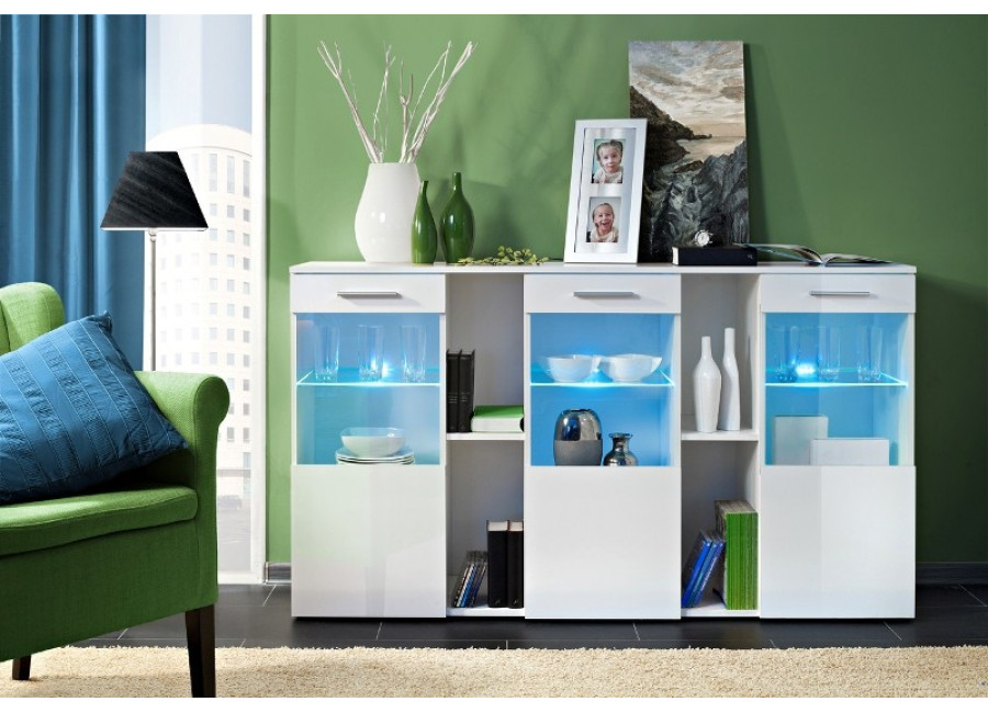 Komoda DORADE má 3 dvierka so sklom. Za dvierkami sa nachádza jedna sklenená polica a dve klasické drevené poličky. Medzi dvierkami je otvorený priestor, ktorý určite využijete na rôzne ozdoby a doplnky. Súčasťou balenia je aj LED osvetlenie sklenených poličiek.