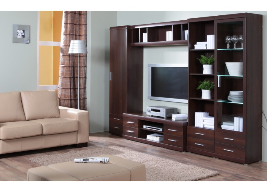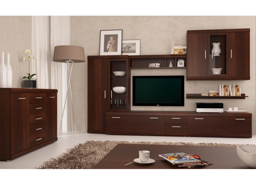 Sektorová obývacia stena IRDEEN umožňuje ľubovoľné zariadenie interiéru. Elegantná kolekcia nábytku vo farebnom prevedení orech imperial je ideálnym riešením pre miestnosti ako sú obývacia stena alebo jedáleň.